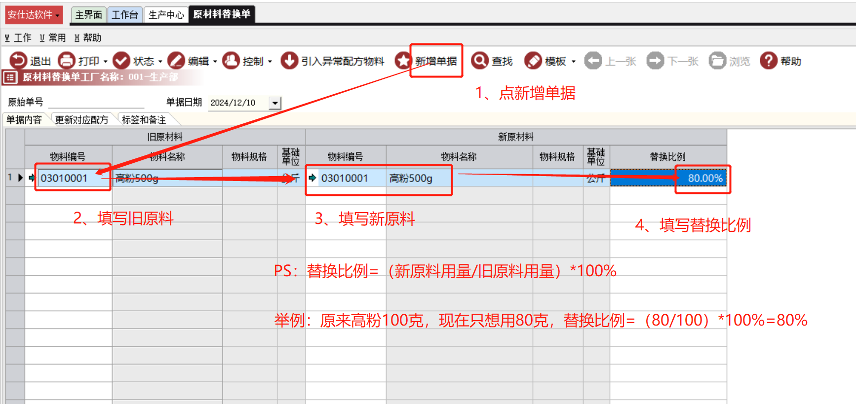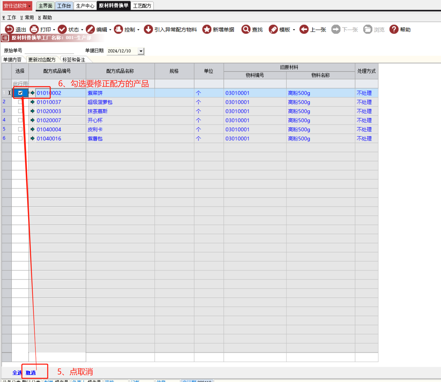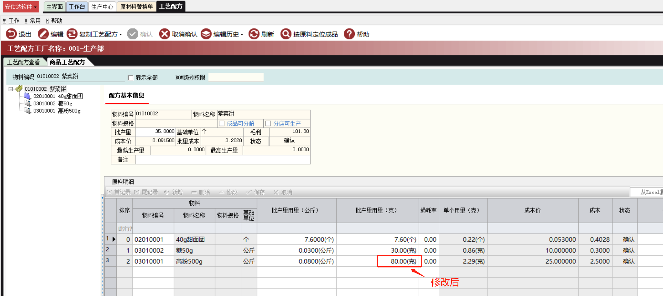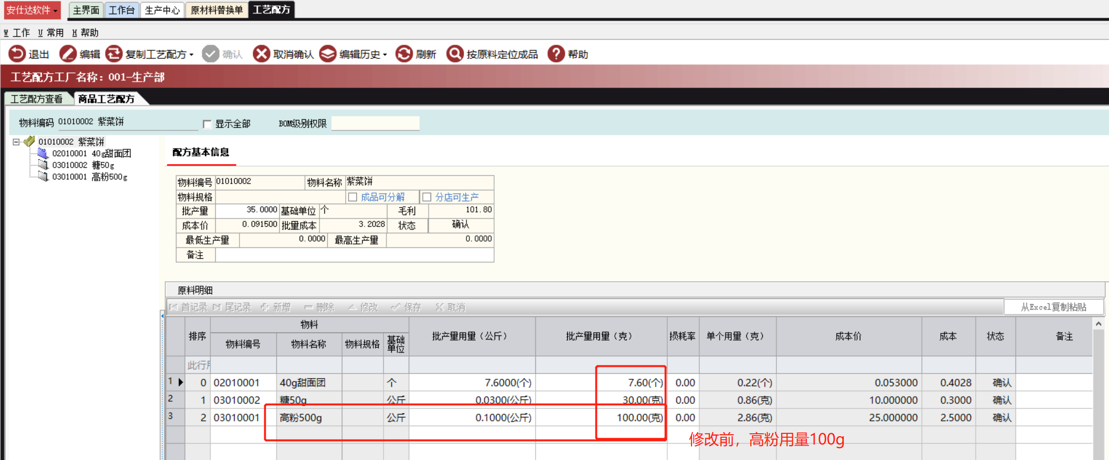 因为配方录入时候,为了确保生产能够领料制作,所以录入配方用量都是带了损耗的,这就会导致配料间配给车间的用量会偏多(制作的产品越多,偏差量就会越大),这个时候就需要通过修改配方来调整用量。