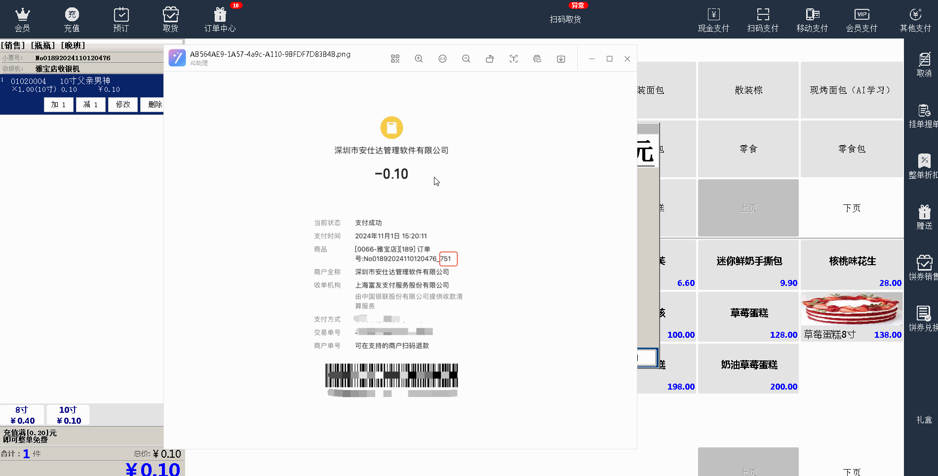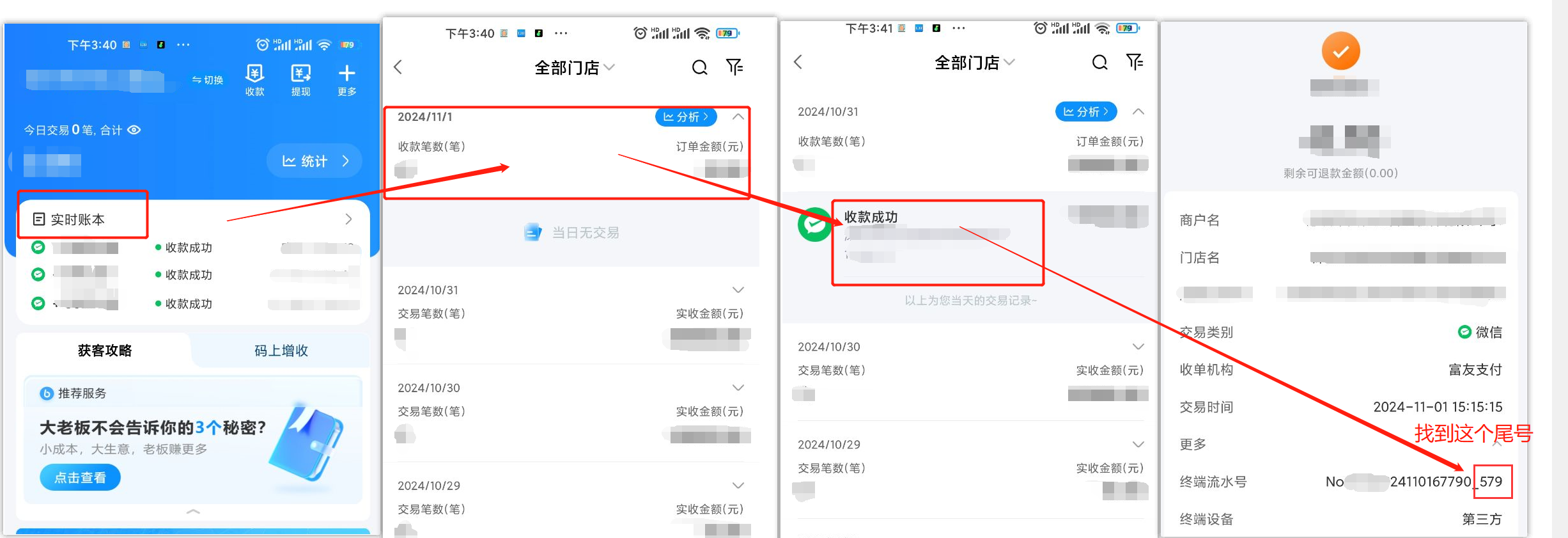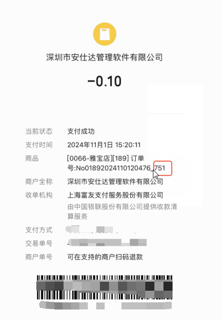 收银员则可以在手机扫呗上查看扣款明细,里面也会有我们的订单号。