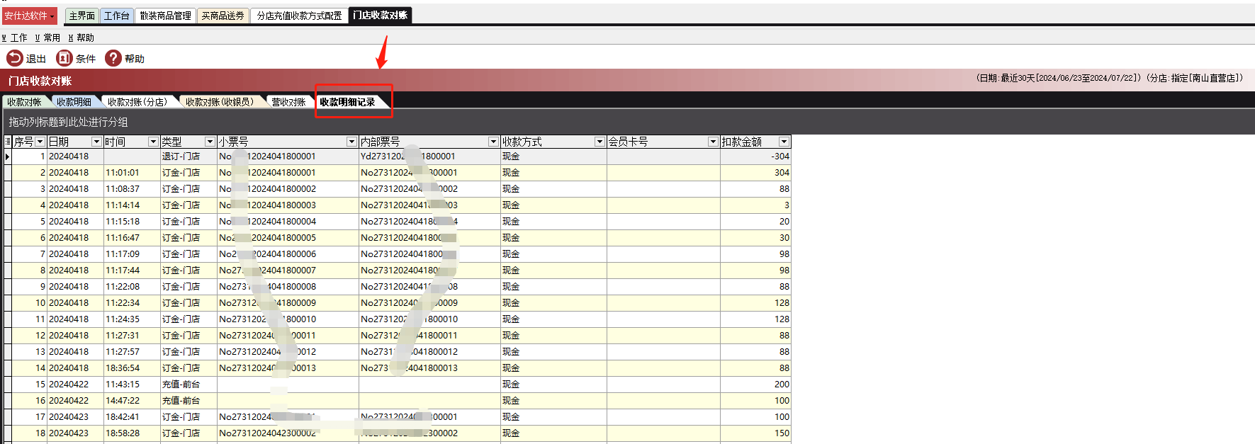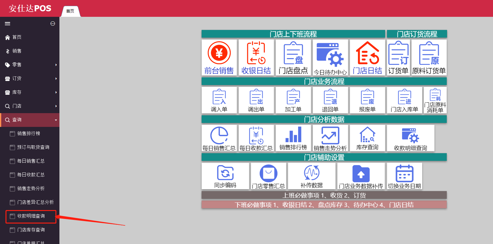 注:该报表前后台都做了,报表在后台的路径为:零售pos-统计分析-门店收款对账--收款明细记录