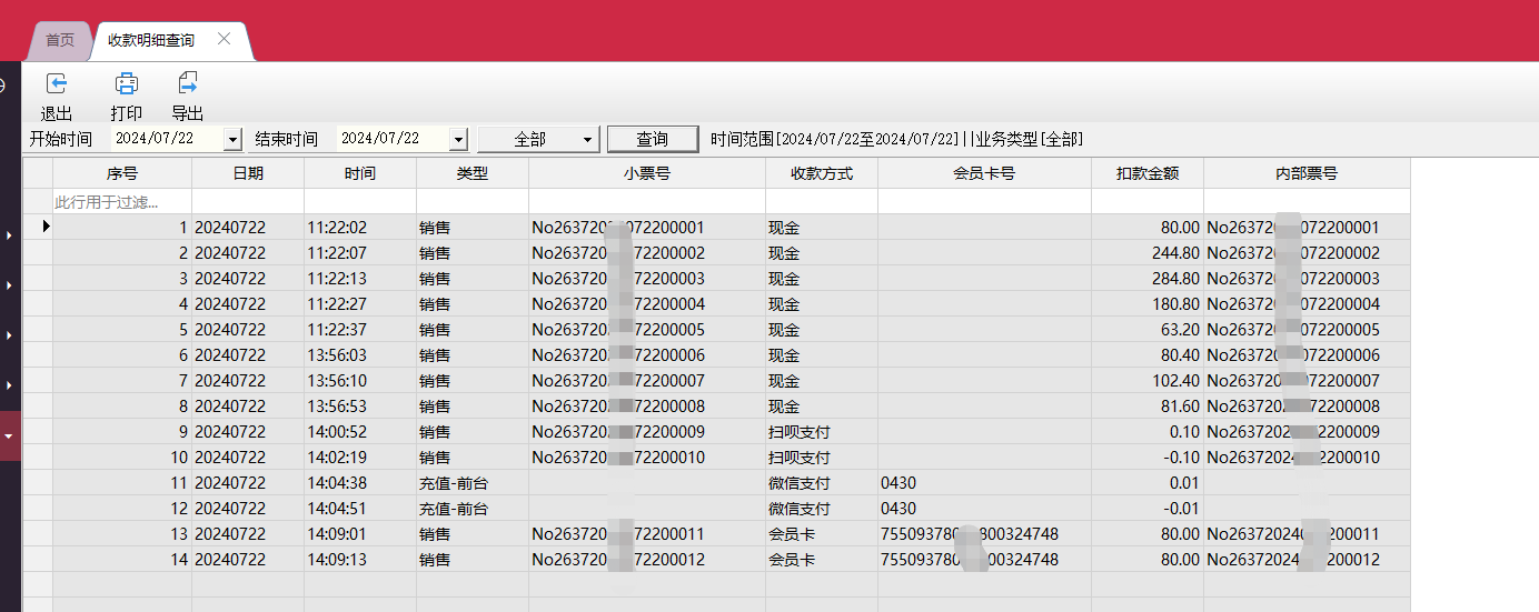 比如,客户对接了扫呗支付,需要核对7.1-7.22日的扫呗收款数据,就可以使用这个报表。 业务类型选择全部,然后过滤扫呗 收款方式,查询出来的就是前台用扫呗收款的所有记录。 数据也支持导出来,然后跟第三方那边进行数据核对。