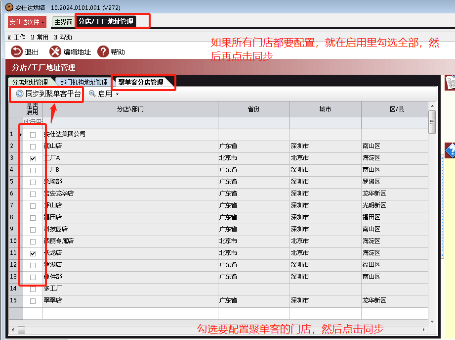 如果要全部同步,点击启用按钮--勾选全部,然后再点同步到聚单客平台。同步成功后,分店后面会自动显示聚单客分店号。