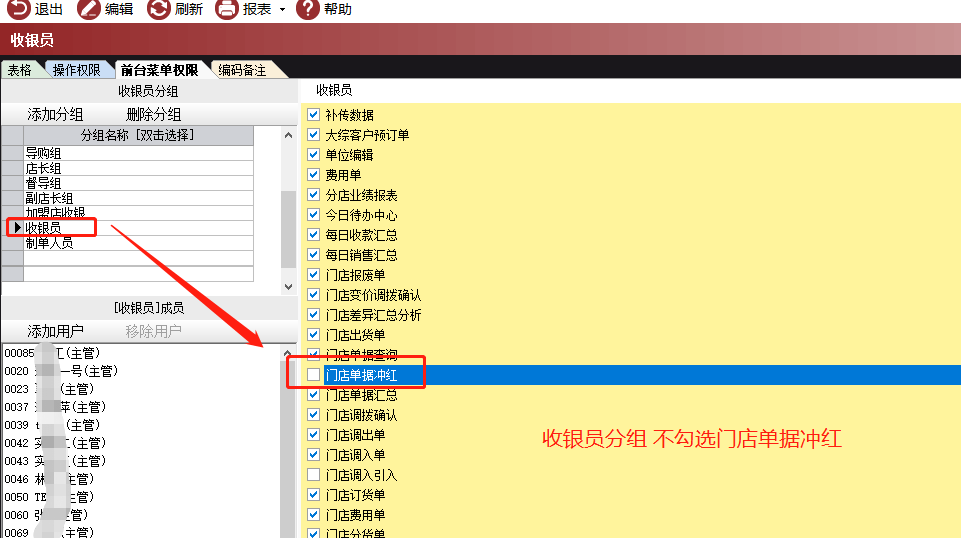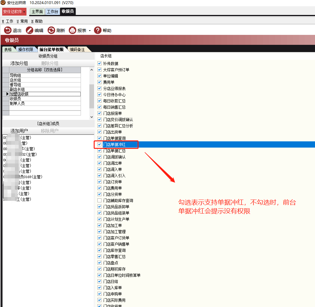收银员菜单权限,添加【门店单据冲红】,勾选表示支持单据冲红,不勾选时,前台单据冲红会提示没有权限。