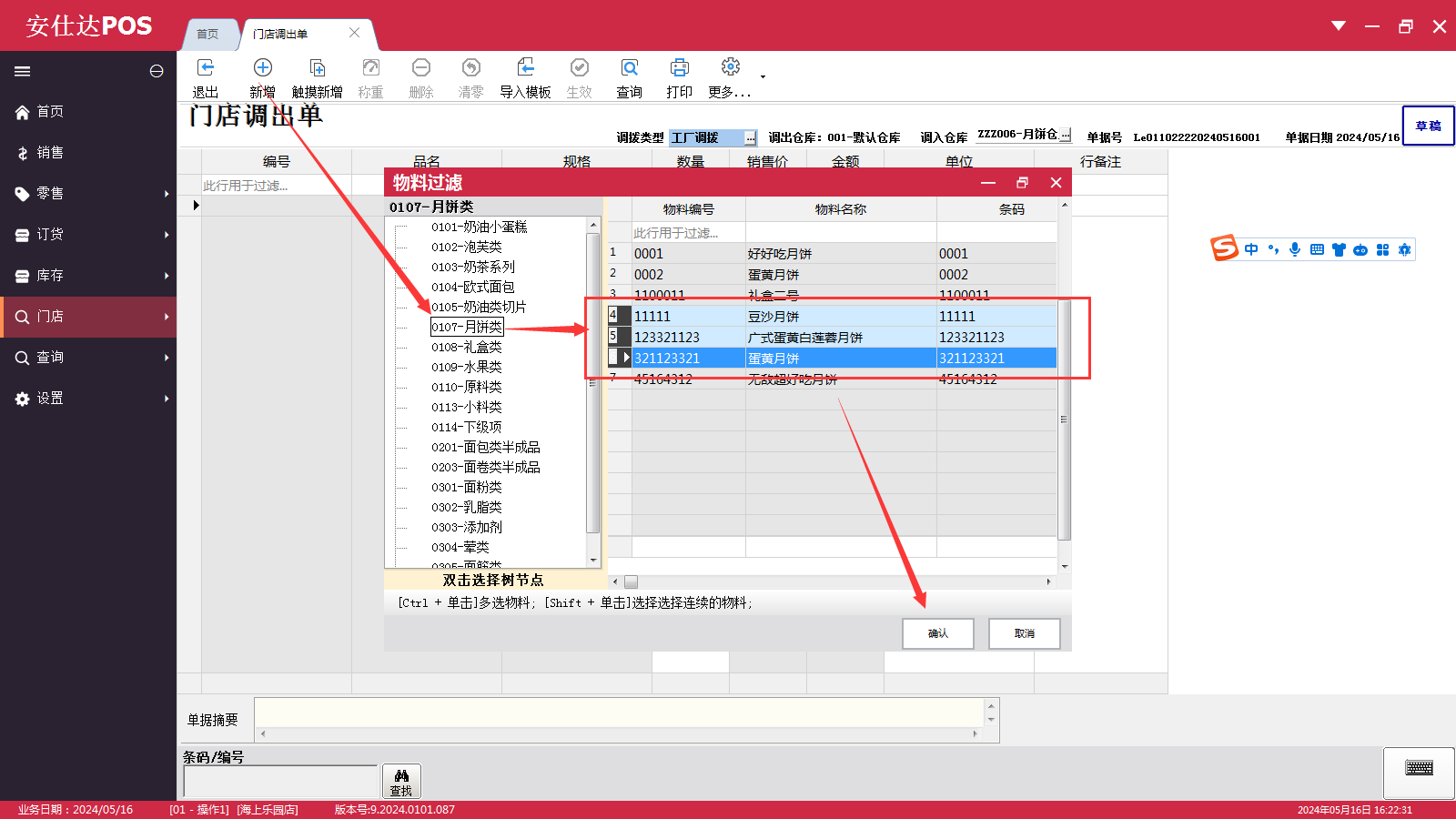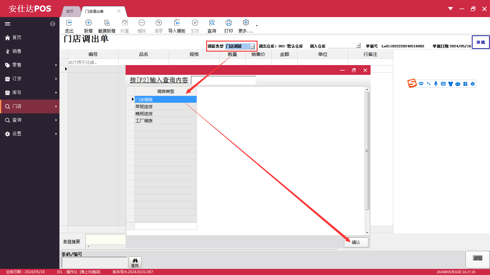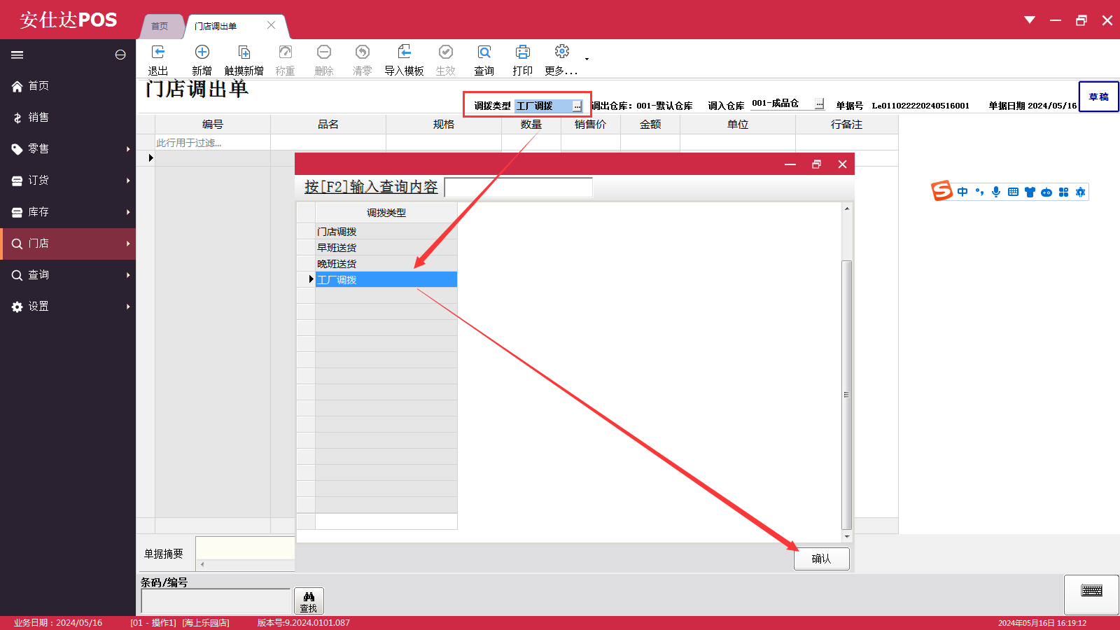 1.门店给工厂(后台调拨),第一步选择调拨类型为工厂调拨