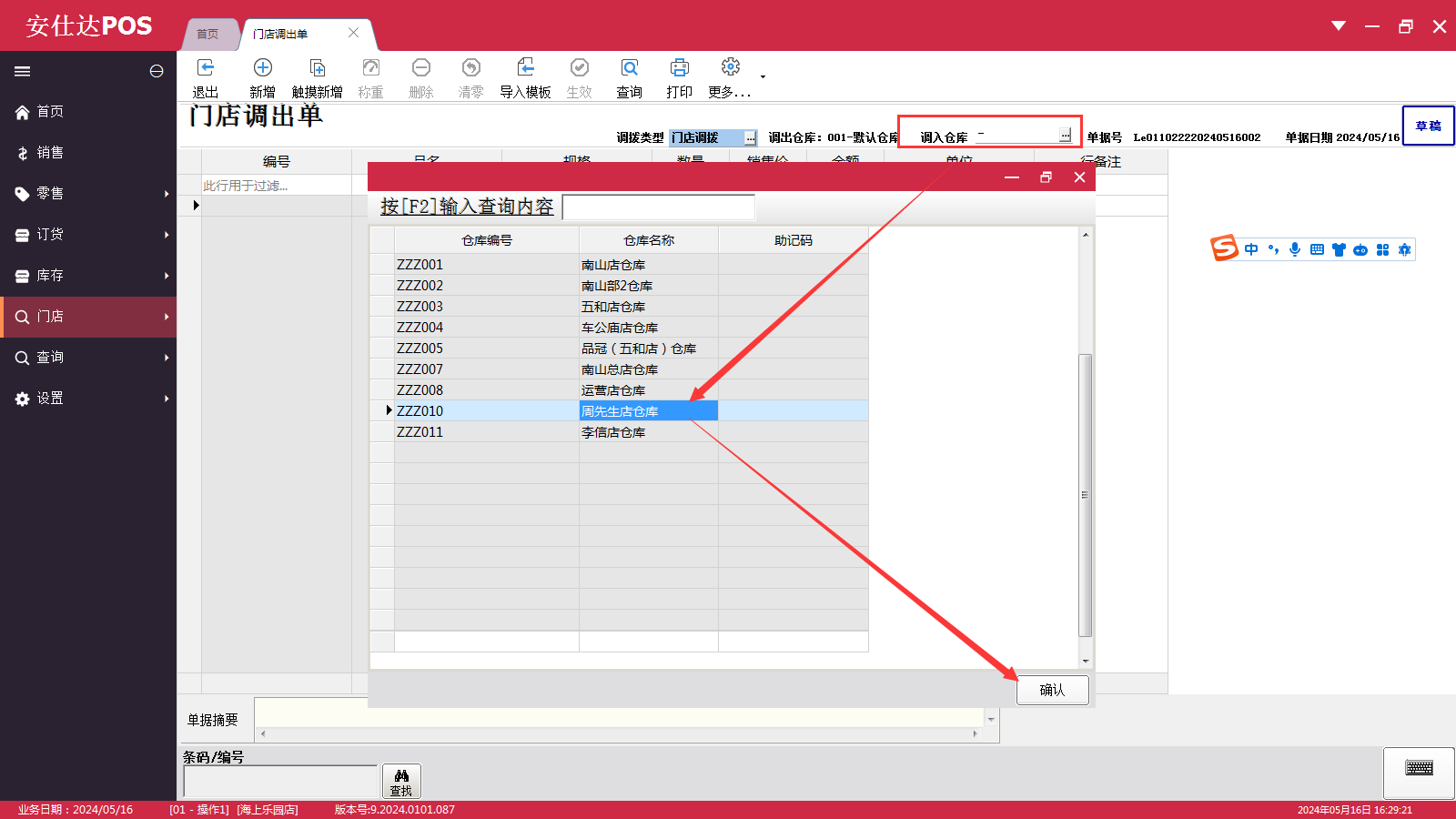 2.选择需要调给的门店仓库(选择门店调拨后,那入库仓库就只能选择门店的仓库)