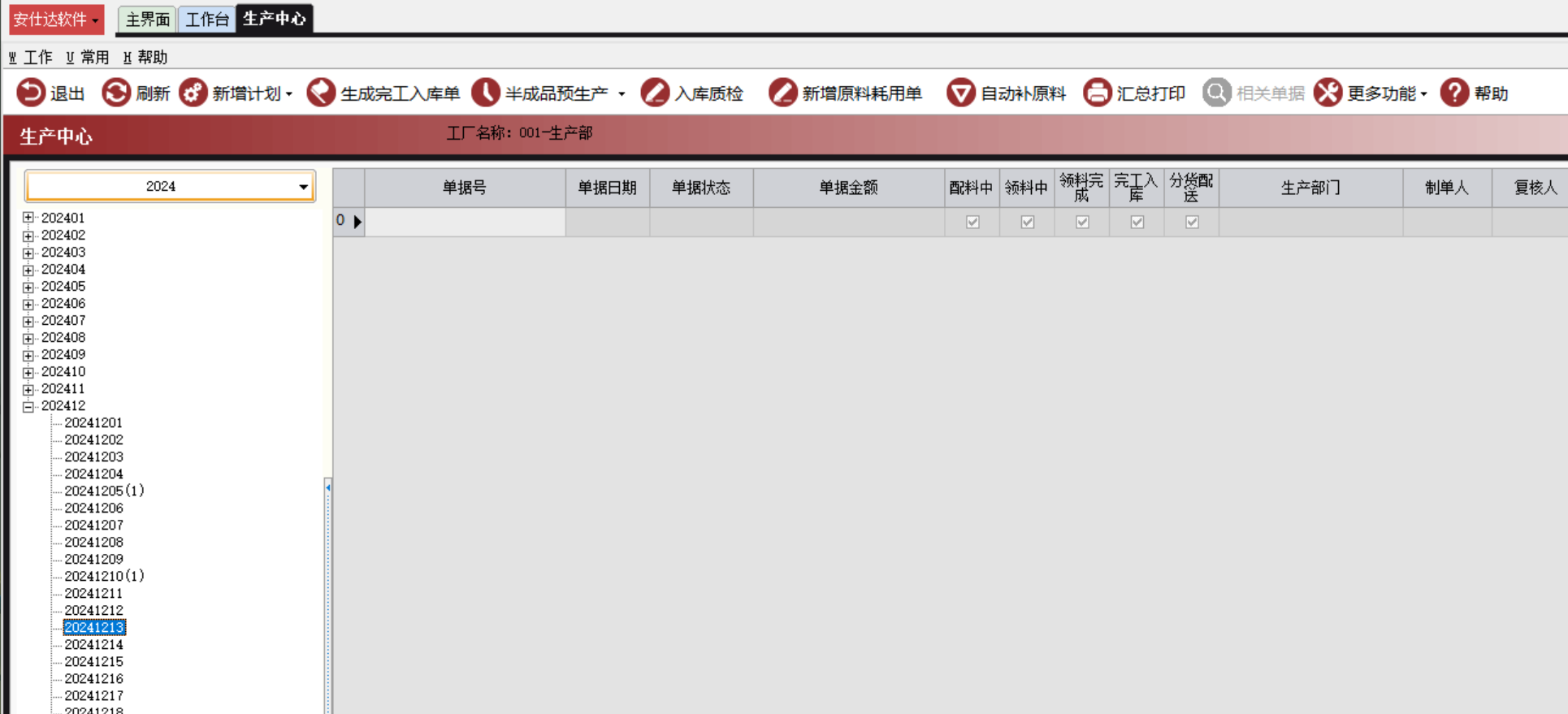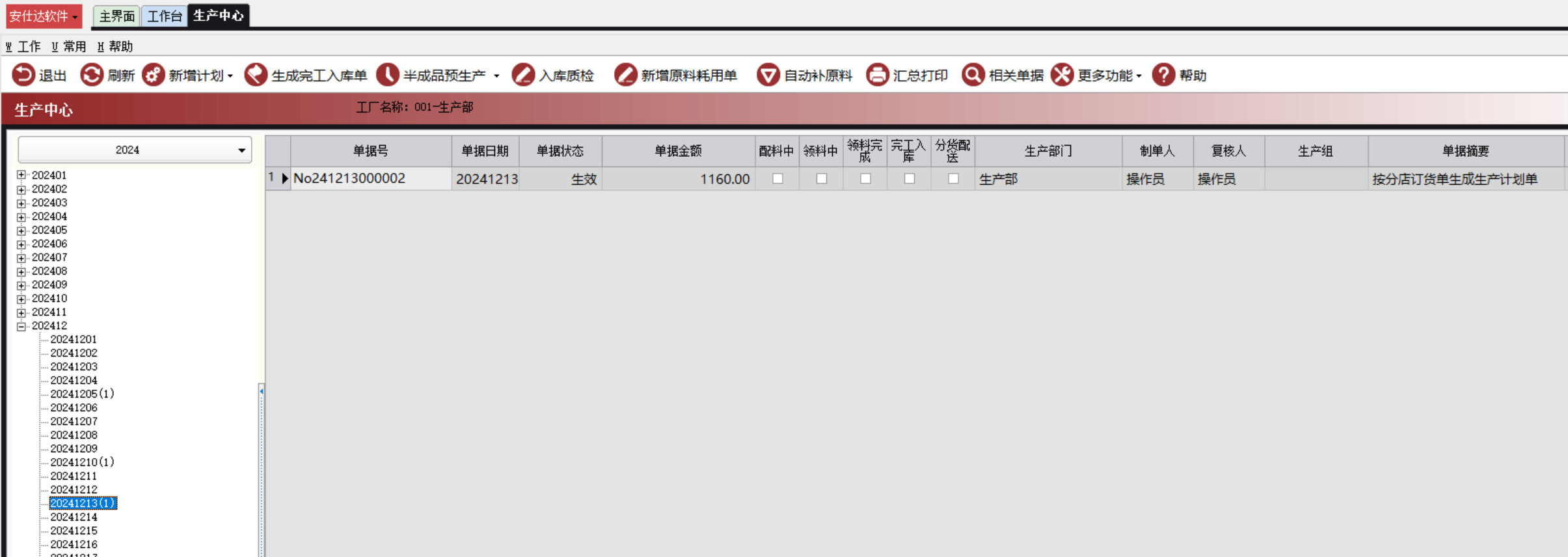 “生产计划单”生成后,显示在“生产中心”界面如图: