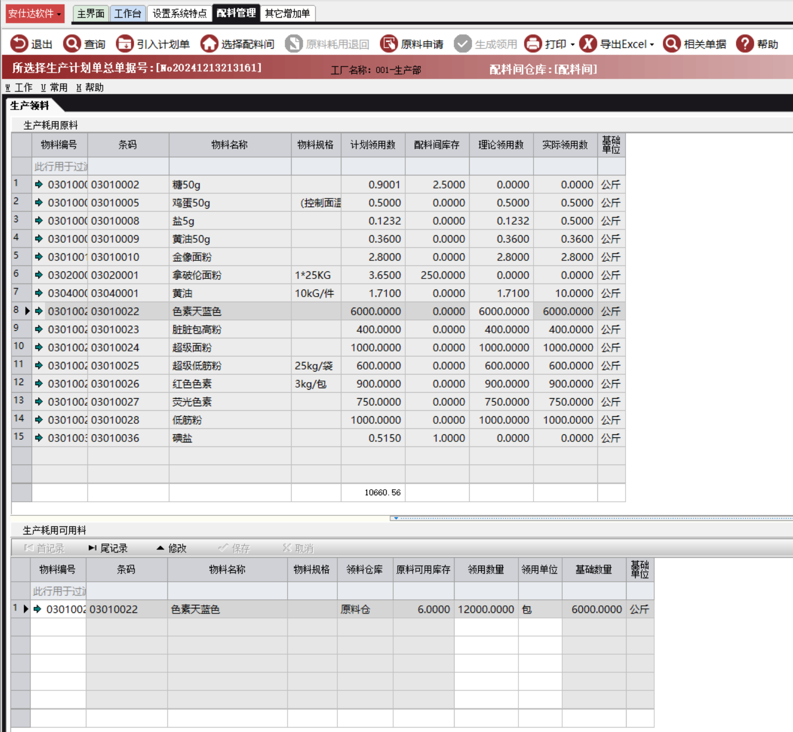 实际领用数:默认数值为理论数量的大单位用量,举例理解:低筋粉50kg一袋,计划领用数量为:75公斤,配料间库存为0,此时理论用量为75kg,实际领用则为100kg(2袋);
