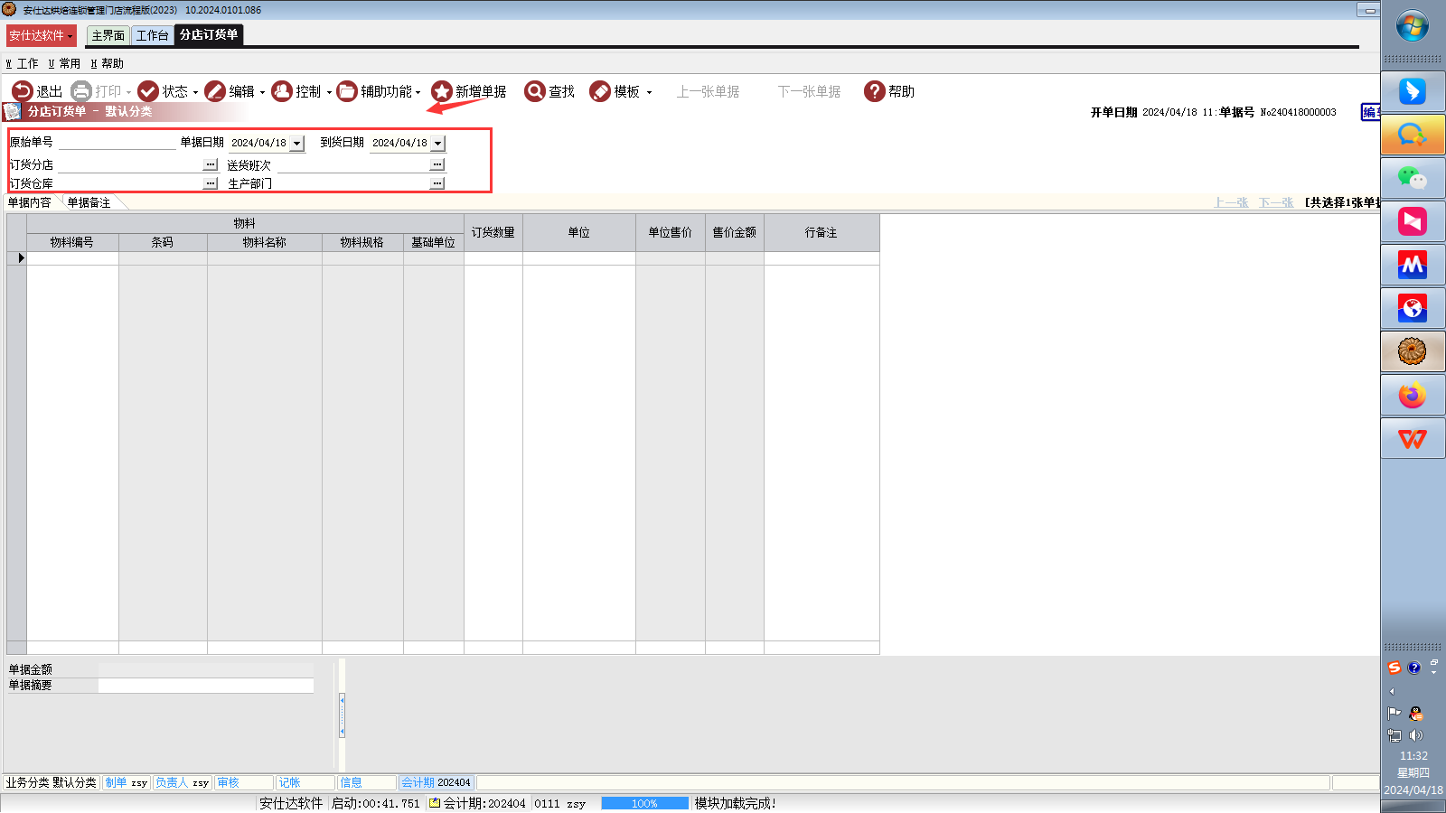 1.新增单据,填写单据内容比如订货分店、订货仓库等信息,如图: