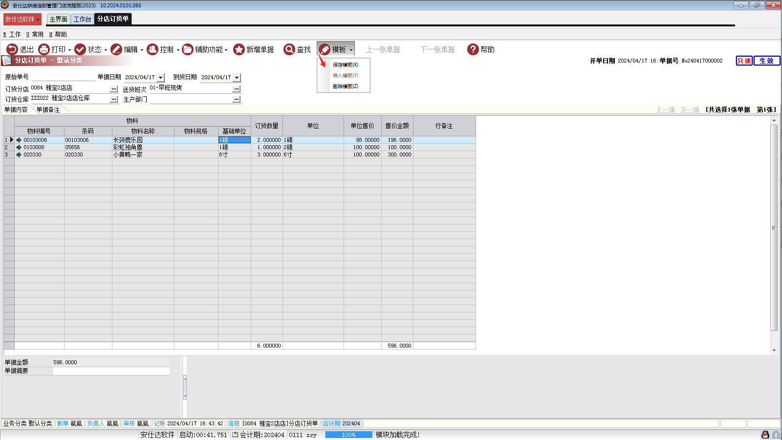 保存为模板:某分店做好一张分店订货单后,可以保存为模块,这样如果下次的订货跟这次订货内容相差不大,就可以直接导入模板,导入模板后,单据明细就是模板中的单据明细。