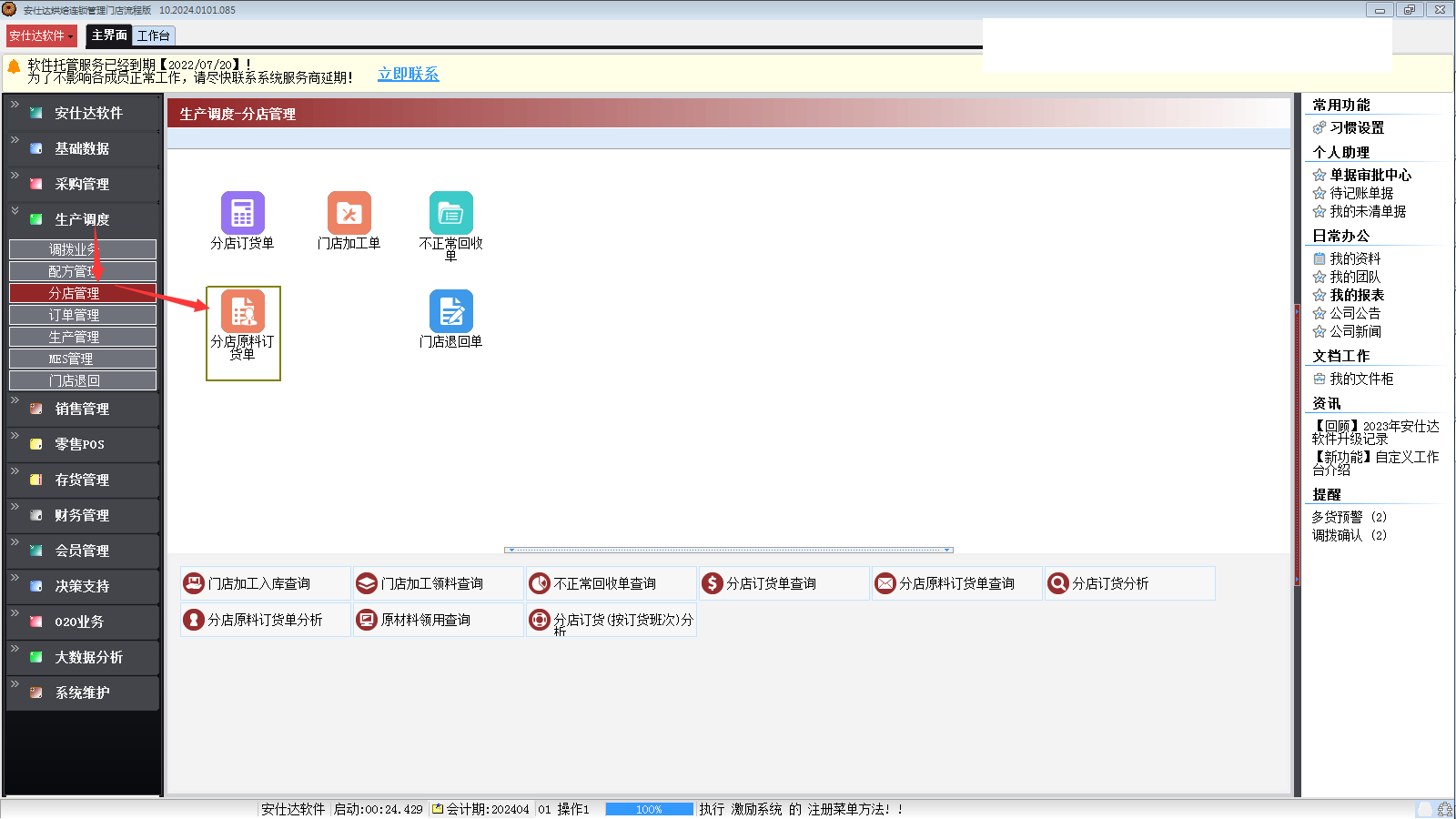 路径:【进入系统】→【生产调度】→【分店管理】→【分店原料订货单】