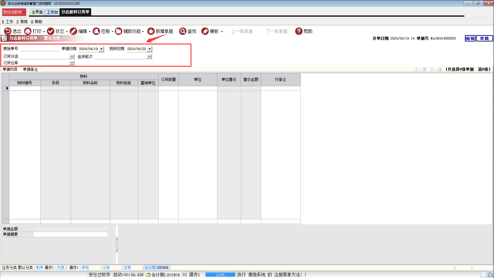 1.新增单据,填写单据内容比如订货分店、订货仓库等信息,如图: