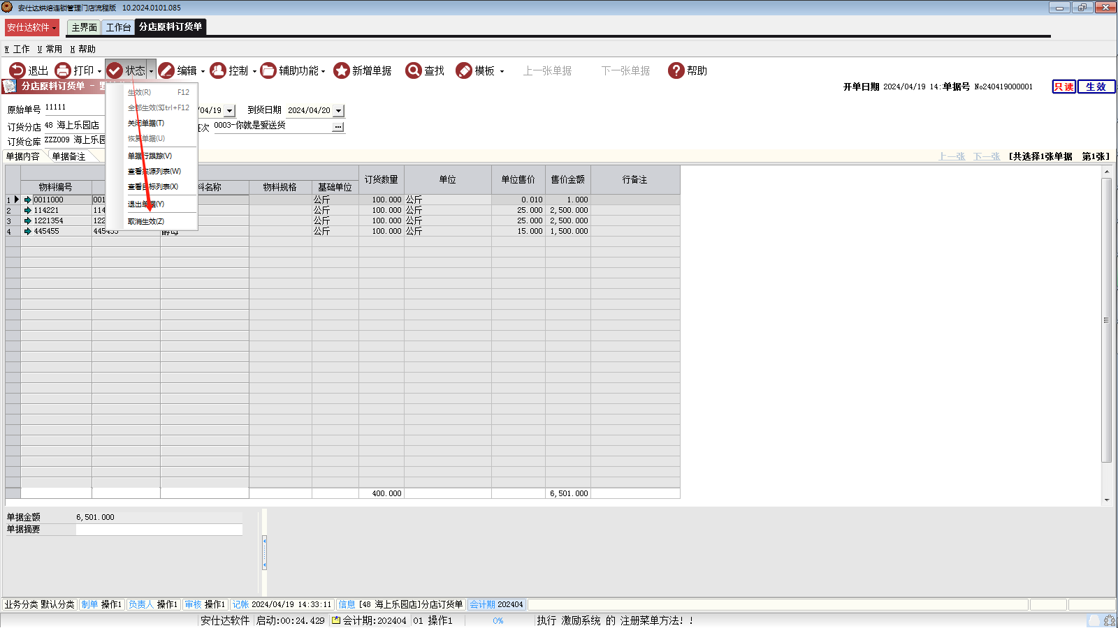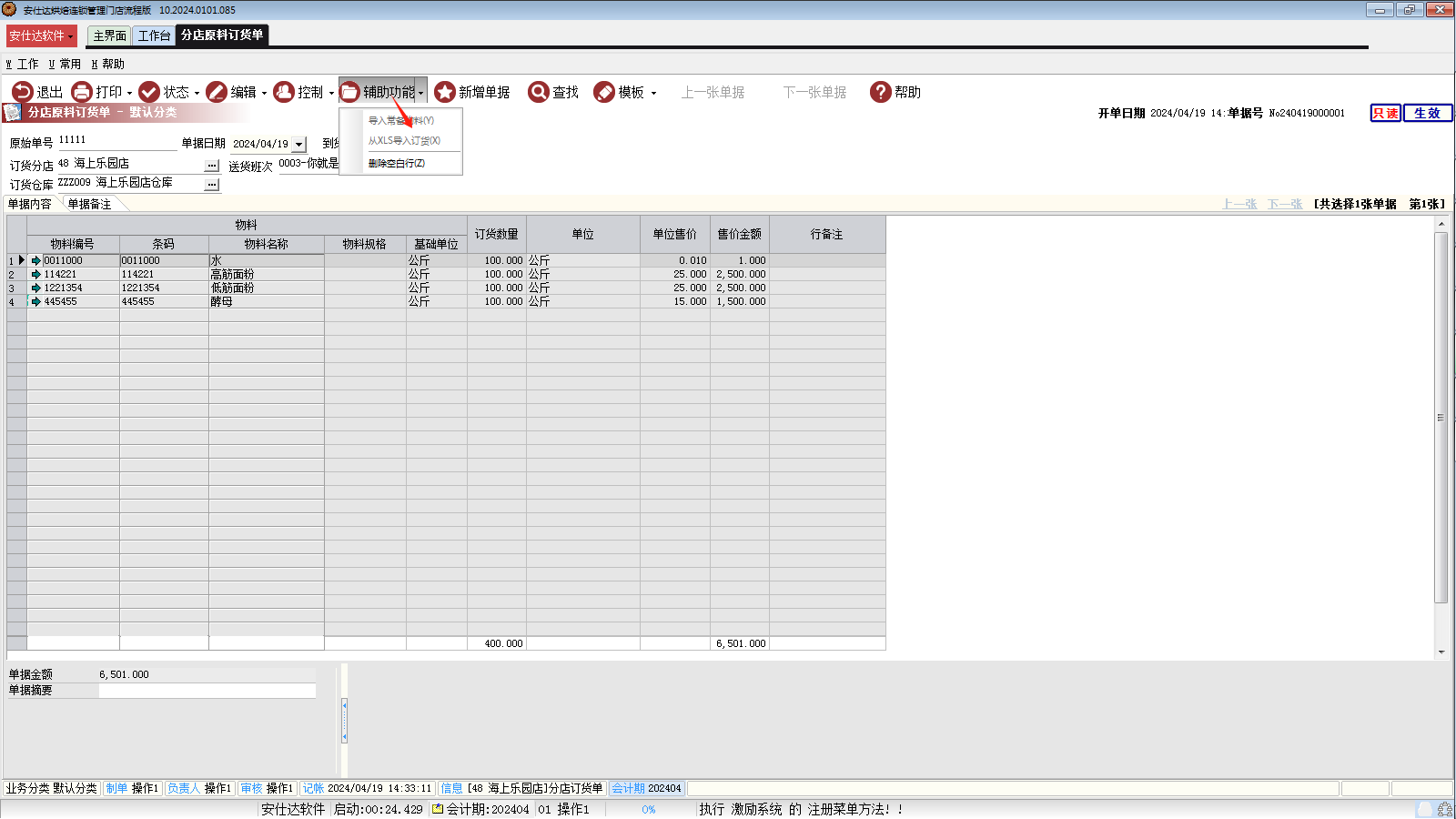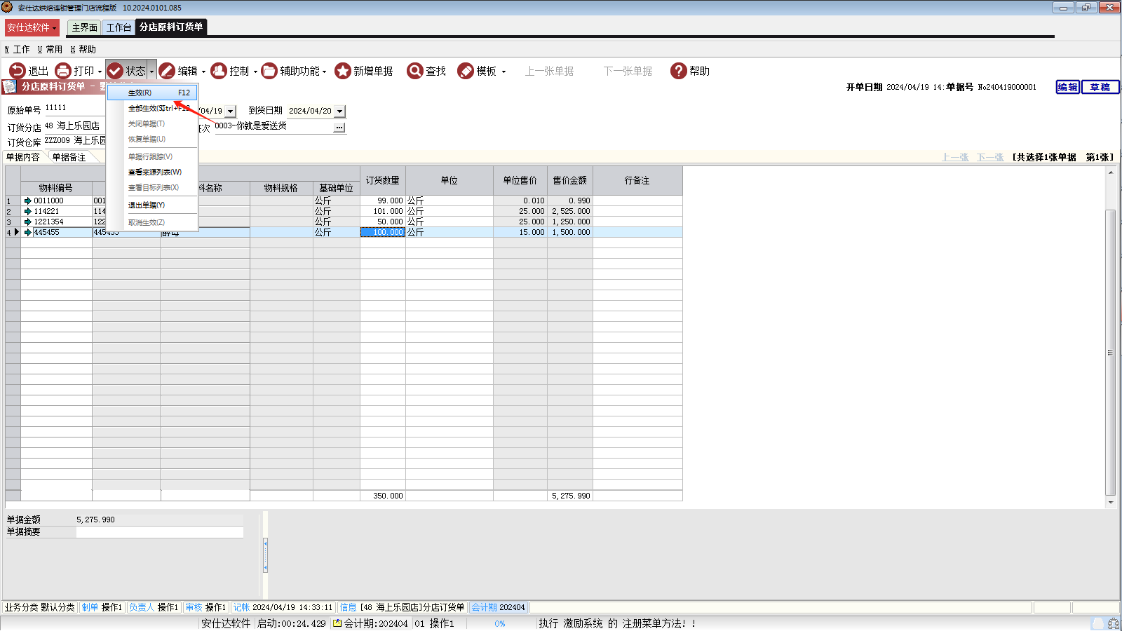 前面已经指导如何添加分店原料订货单据,现在我来指导如何修改已生效分店原料订货单据