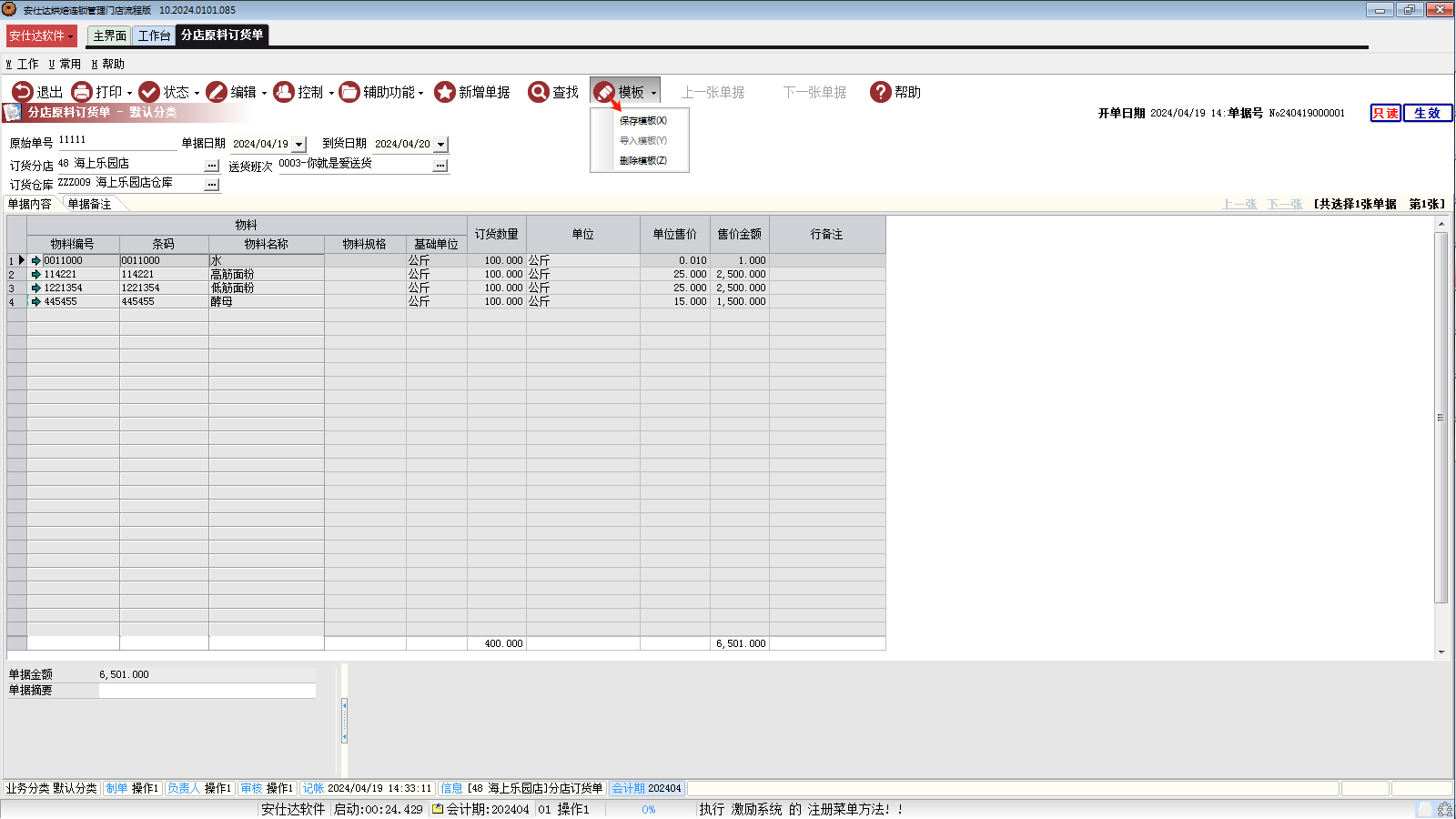 保存为模板:某分店做好一张分店订货单后,可以保存为模块,这样如果下次的订货跟这次订货内容相差不大,就可以直接导入模板,导入模板后,单据明细就是模板中的单据明细。
