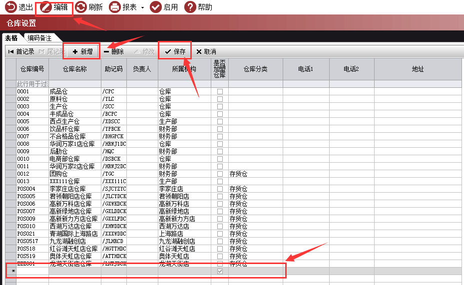 1、点开仓库设置菜单,点编辑,新增,输入仓库编号,仓库名称,所属机构,选择仓库分类,保存参考信息,如图: