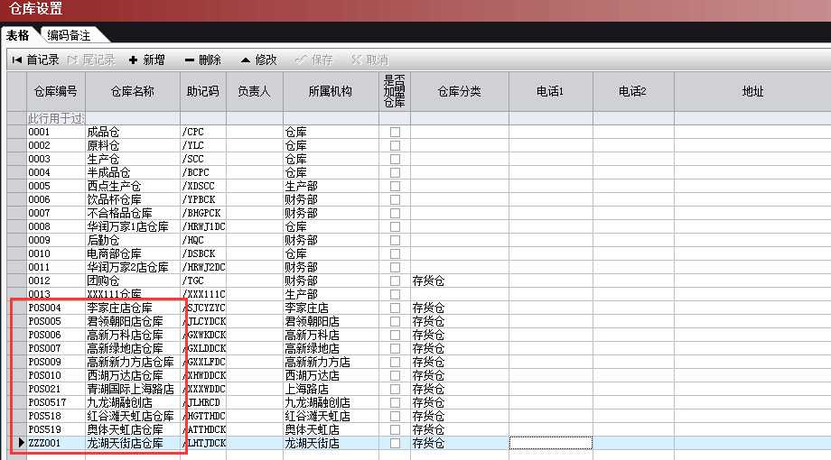 3、需要注意的是如果仓库编号前缀是POS,那么这些仓库都是门店仓库,是新增门店信息后,系统自动生成的仓库,不能随意修改或者删除。