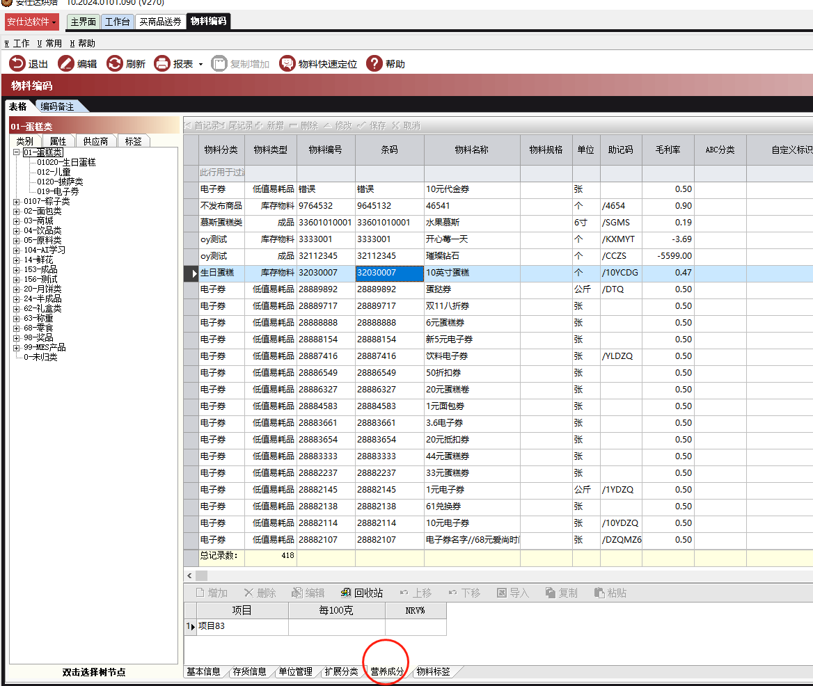 选择物料A--点击复制按钮--选择物料B,会把A的营养成分复制粘贴给B物料。 举例说明:把物料天使之翼的营养成分直接复制给 天鹅蛋糕,操作如下:
