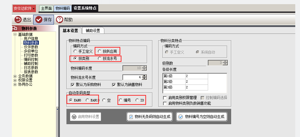 1、特点设置:物料编码和条码需要选择系统自动生成,且自动条码类型不能为空。
