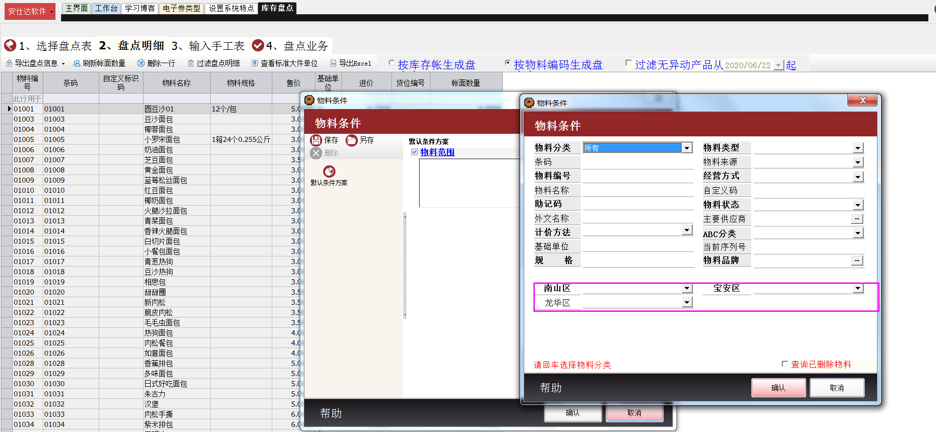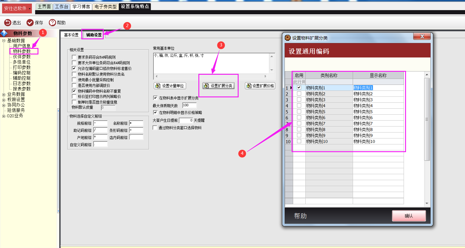 ②展开基础数据->物料参数,点击辅助设置,然后在点击设置扩展分类,勾选需要启用的扩展分类,并修改显示名称,然后点击确认