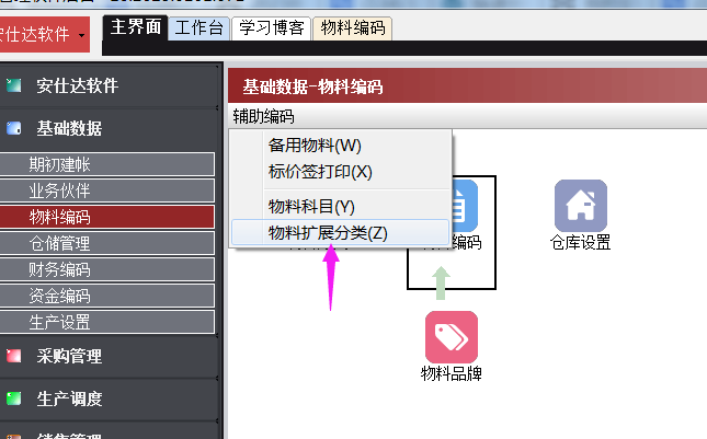 ③依次打开,基础数据->物料编码->辅助编码->物料扩展分类