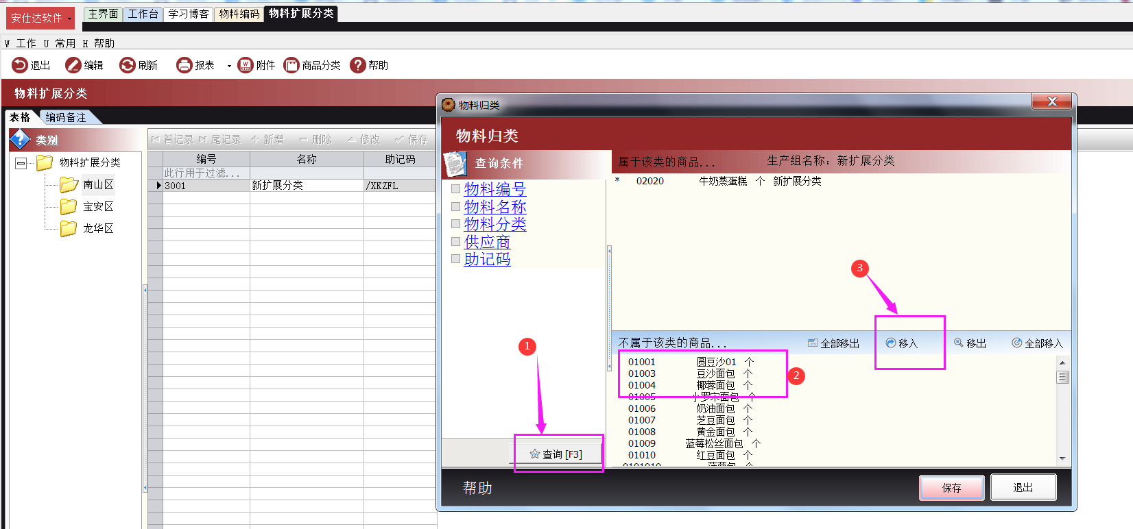 ⑤查询出需要归属到扩展分类里面的产品,选中后点击移入,最后点击保存,这样扩展分类对应的商品就设置好了