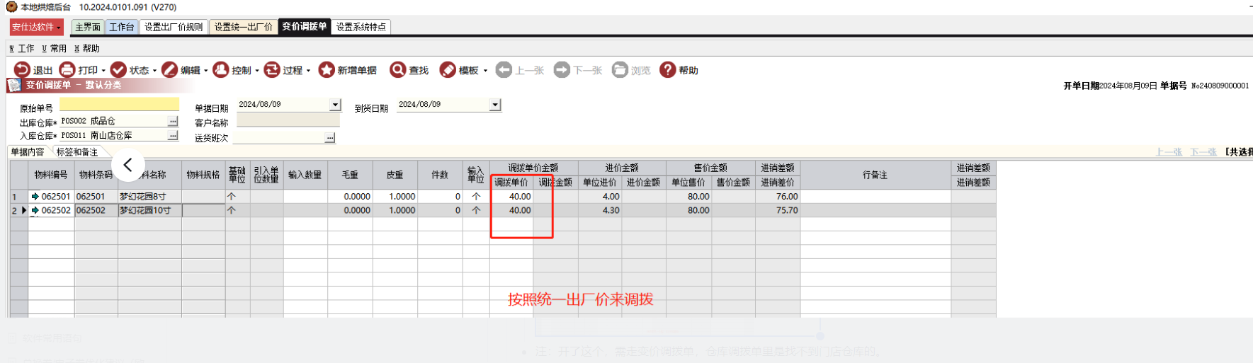 调拨时,物料的调拨单据就取设置好的统一出厂价。