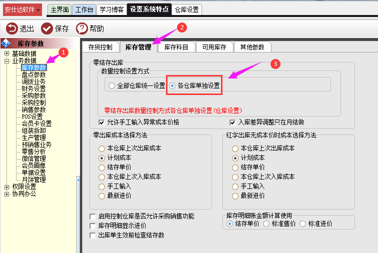 ②依次展开,业务数据->库存参数,点击库存管理,然后在数量控制设置方式里面选择【各仓库单独设置】,点击保存,然后退出即可