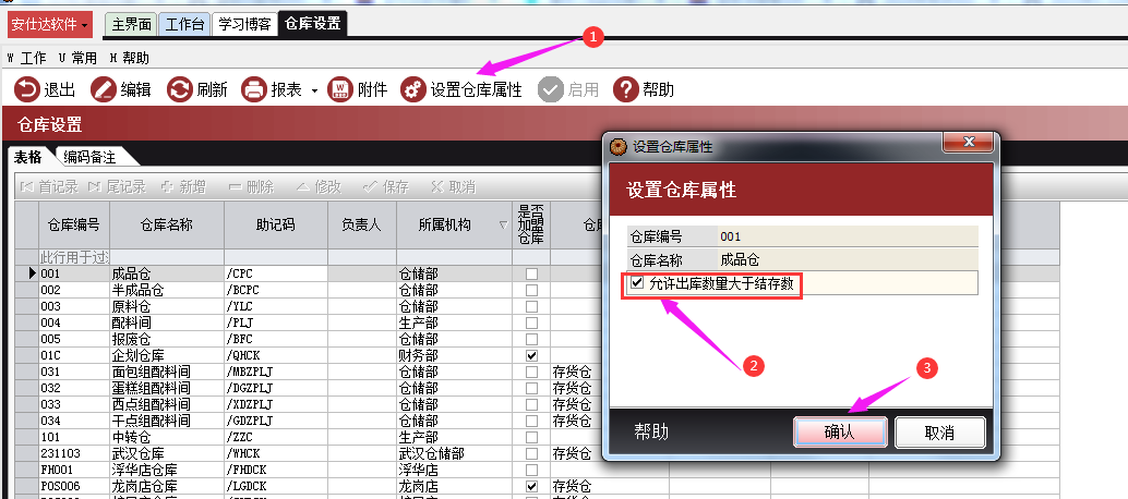 ②选择对应仓库,点击设置仓库属性,如果当前设置的仓库允许负库存出库,则勾选【允许出库数量大于结存数】,然后点击确认,如果不控制就不勾选。