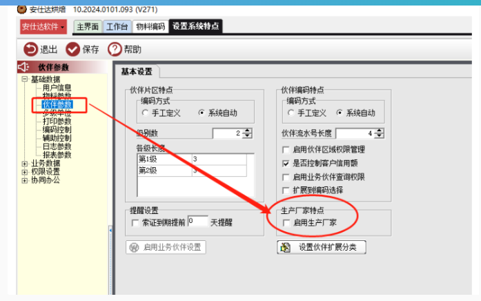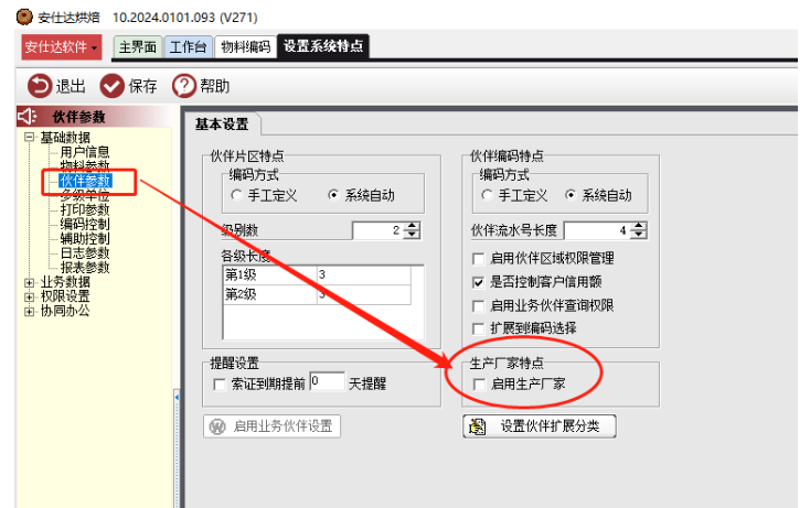 特点路径:基础设置--伙伴参数--启用生产厂家,默认不勾选。