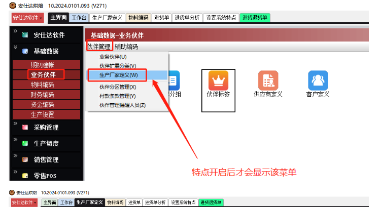 要先开启上述特点后,这个生产厂家定义菜单才会显示。