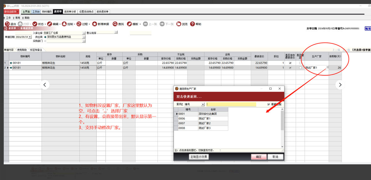 目的:后续做进货、退货单时,会自动带出设置好的厂家。如果设置多个,默认取第一个。