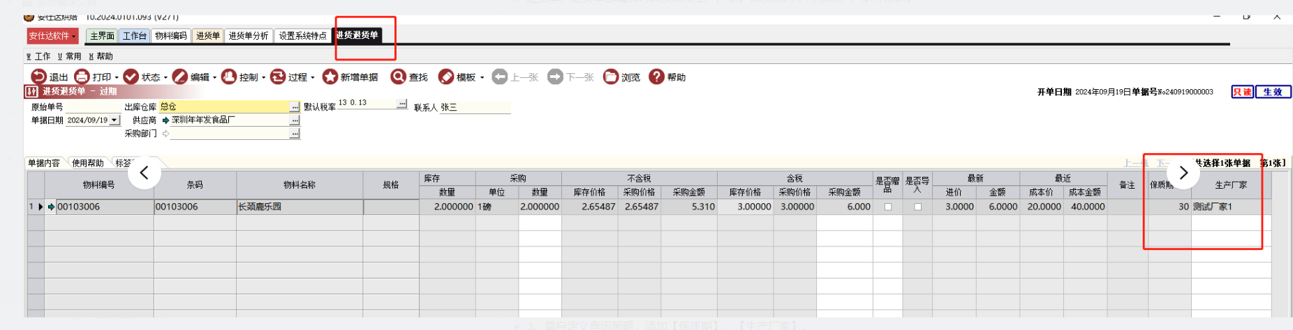 3.4、进货单、退货单都增加列保质期和生产厂家。