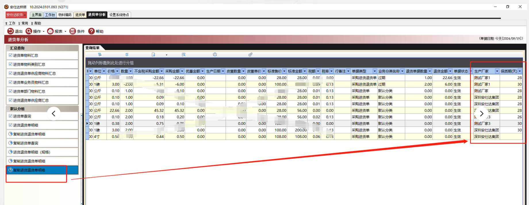 3.5、报表 查询:进货单分析的进货退货单明细,添加【保质期】、【生产厂家】字段