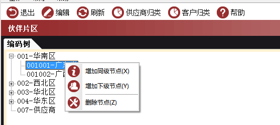 1、通过伙伴片区可以选择目录右键添加同级节点或者下级节点,比如华南区下增加其他子地区,如下图
