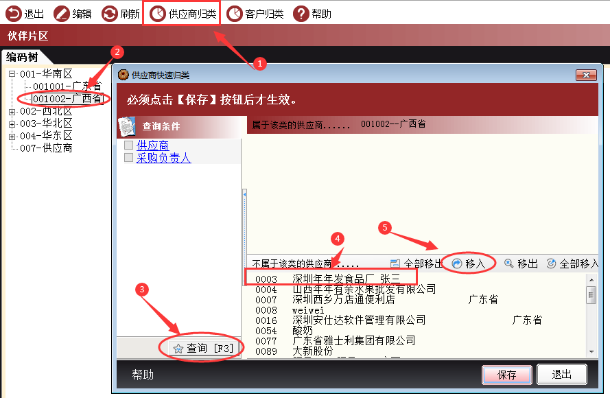 2、也可以对一些不属于该地区的业务伙伴调整到指定的地区中,举例将0003供应商转入到广东省地区,可以按照以下图示进行操作: