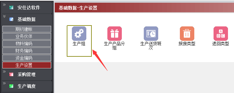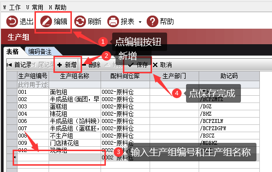 1、打开生产组界面, 点编辑,新增,输入生产组编号和名称,选择配料间仓库和生产部门(可选)