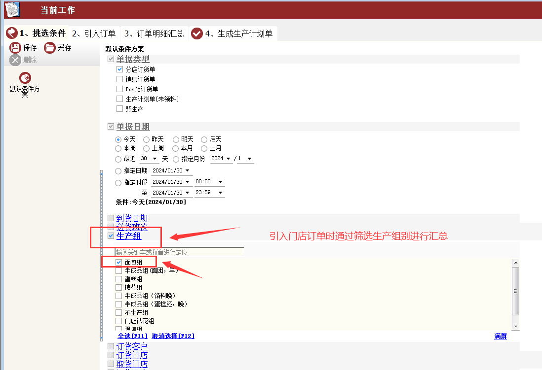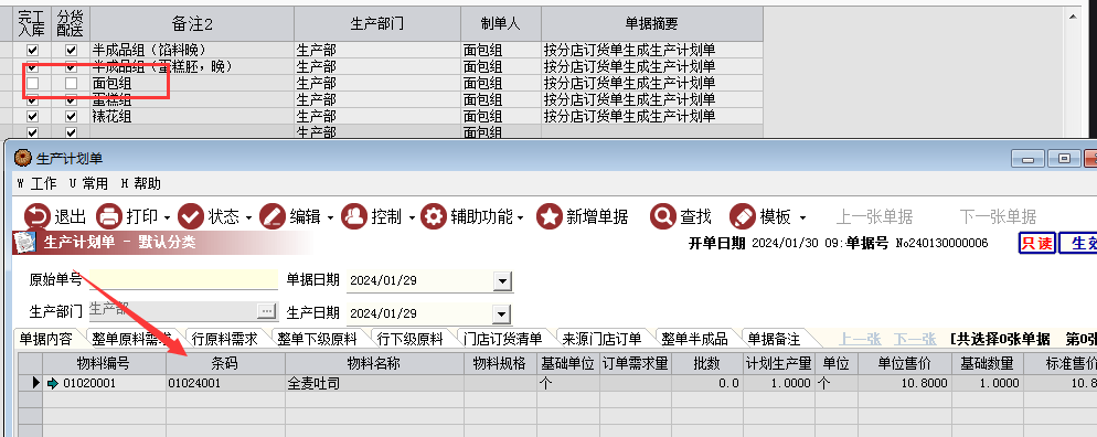案例:生产组定义了面包组,并且绑定了对应的产品全麦吐司,生产计划单汇总门店订单并根据面包组进行汇总,生成生产计划单,如图: