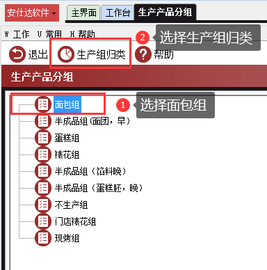 1、进入生产产品分组界面,找到对应面包组进行归类操作,进入下图界面;