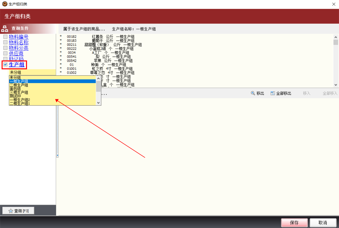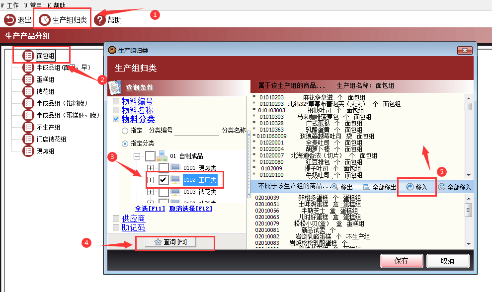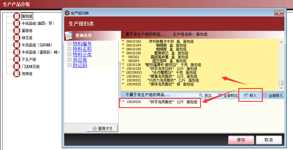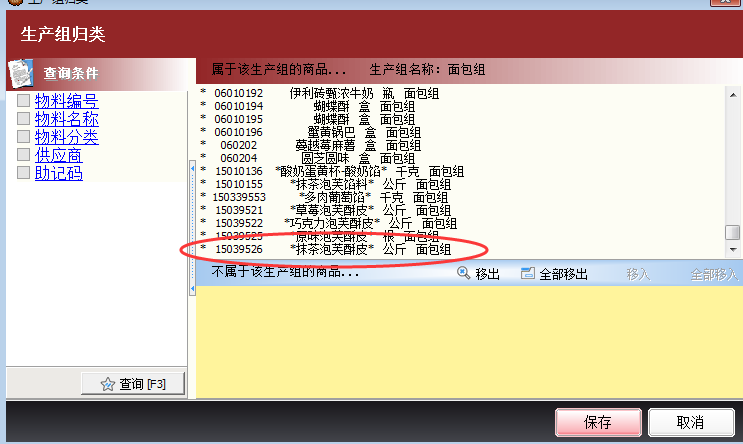 2、生产组归类的窗口左侧是过滤查询条件,如选择工厂面包类,查询,右侧显示所有面包组的产品,如果不属于该生产组,可以全部移入到面包组中,然后保存即可。这样移入的面包类产品生产时归面包组生产。