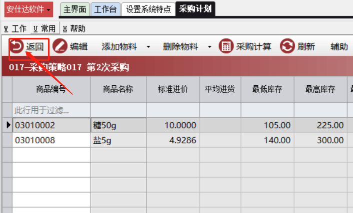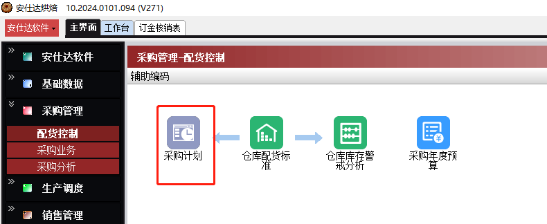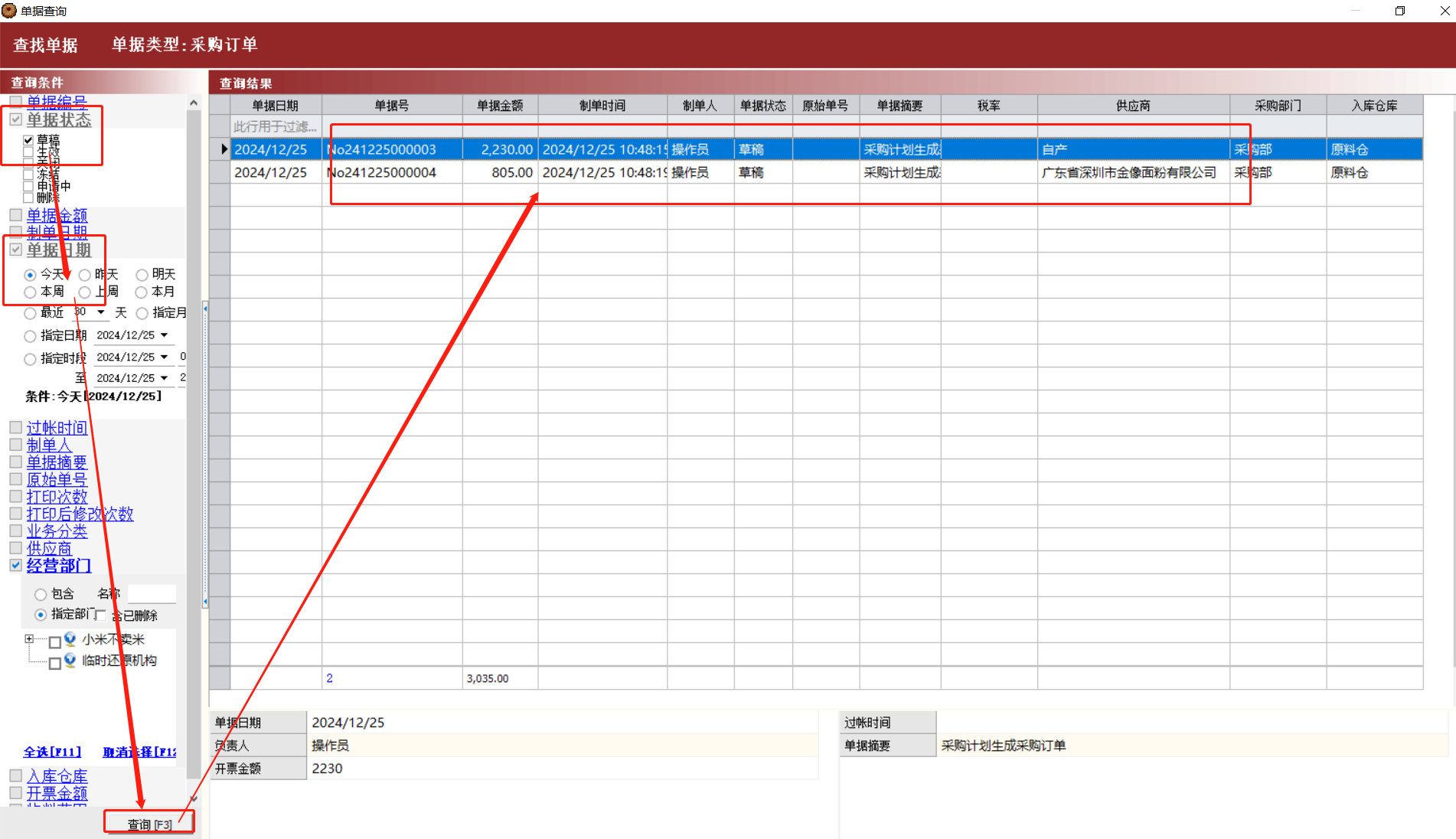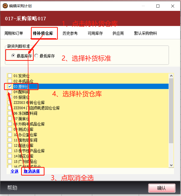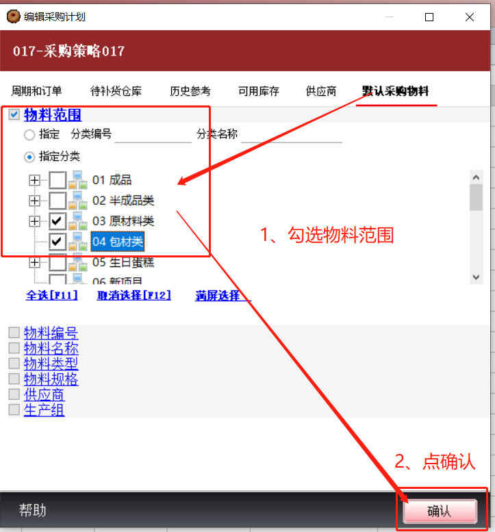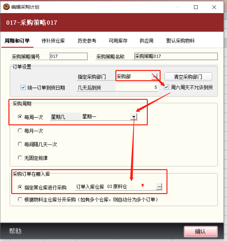 2、选择采购部门,确定设置到货日期,选择采购周期和指定入库仓库