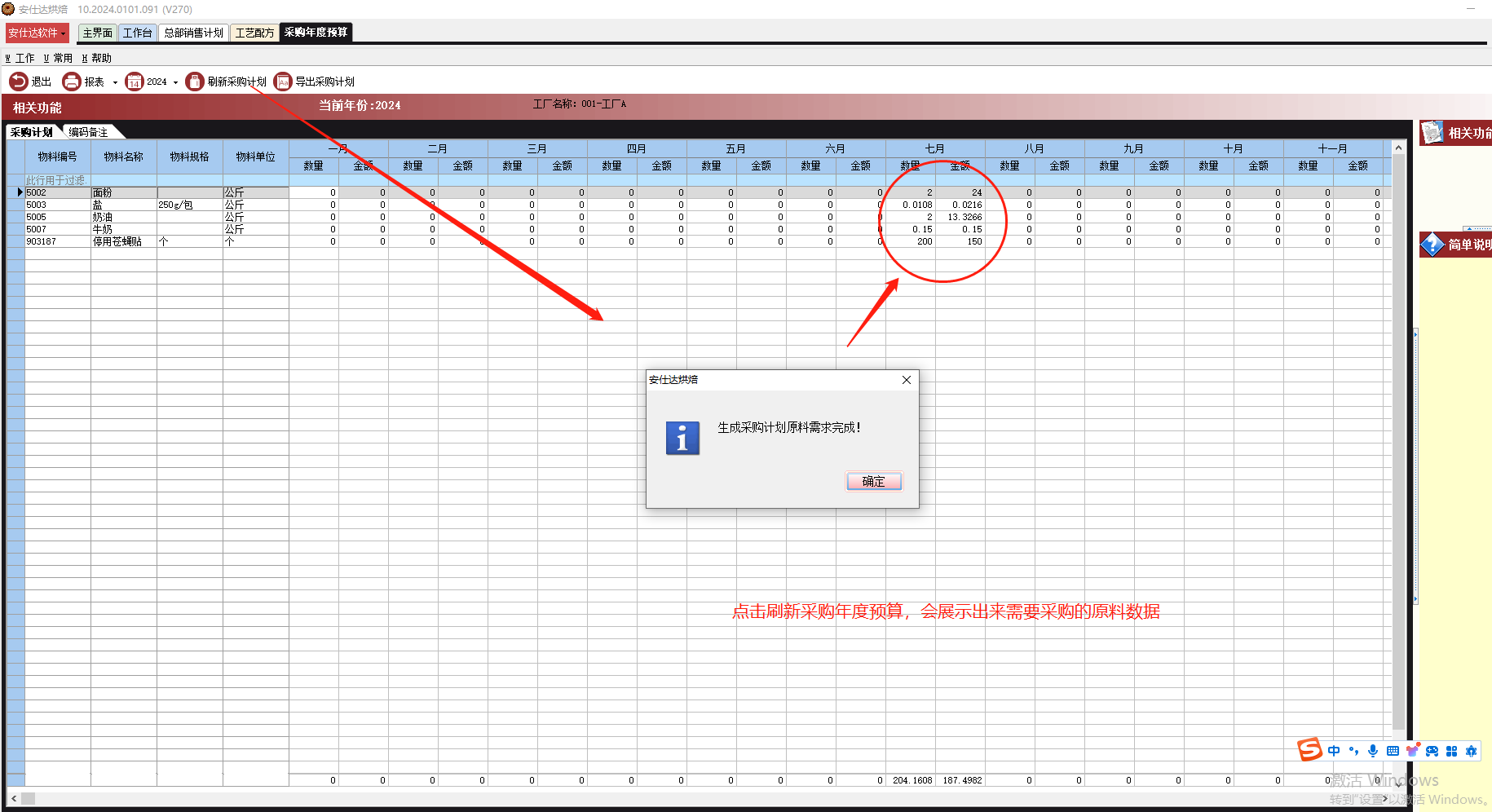 2、在采购年度预算里 ,点击刷新采购计划,则可以看到需要采购的原材料 面粉的数据。客户可以导出数据,根据这些数据去实施采购。