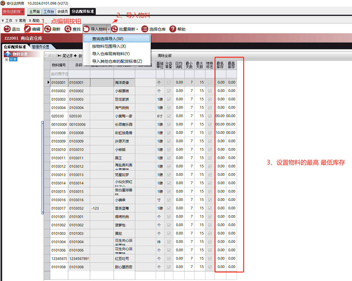 案例:我想设置南山店仓库关于原料类下的乳制品类物料的安全库存,操作GIF演示如下