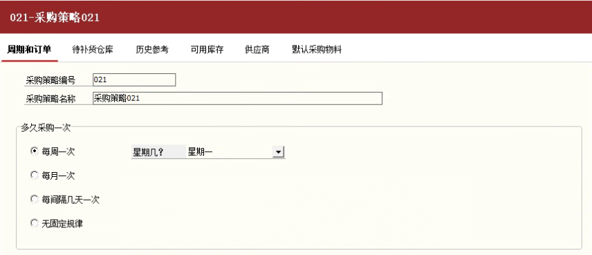 中大型企业,一般是每周几固定采购某些类别的物料,循环往复进行采购工作小型企业,一般是每周固定采购一些常用物料,然后更长的周期(比如几个月)定义采购部门