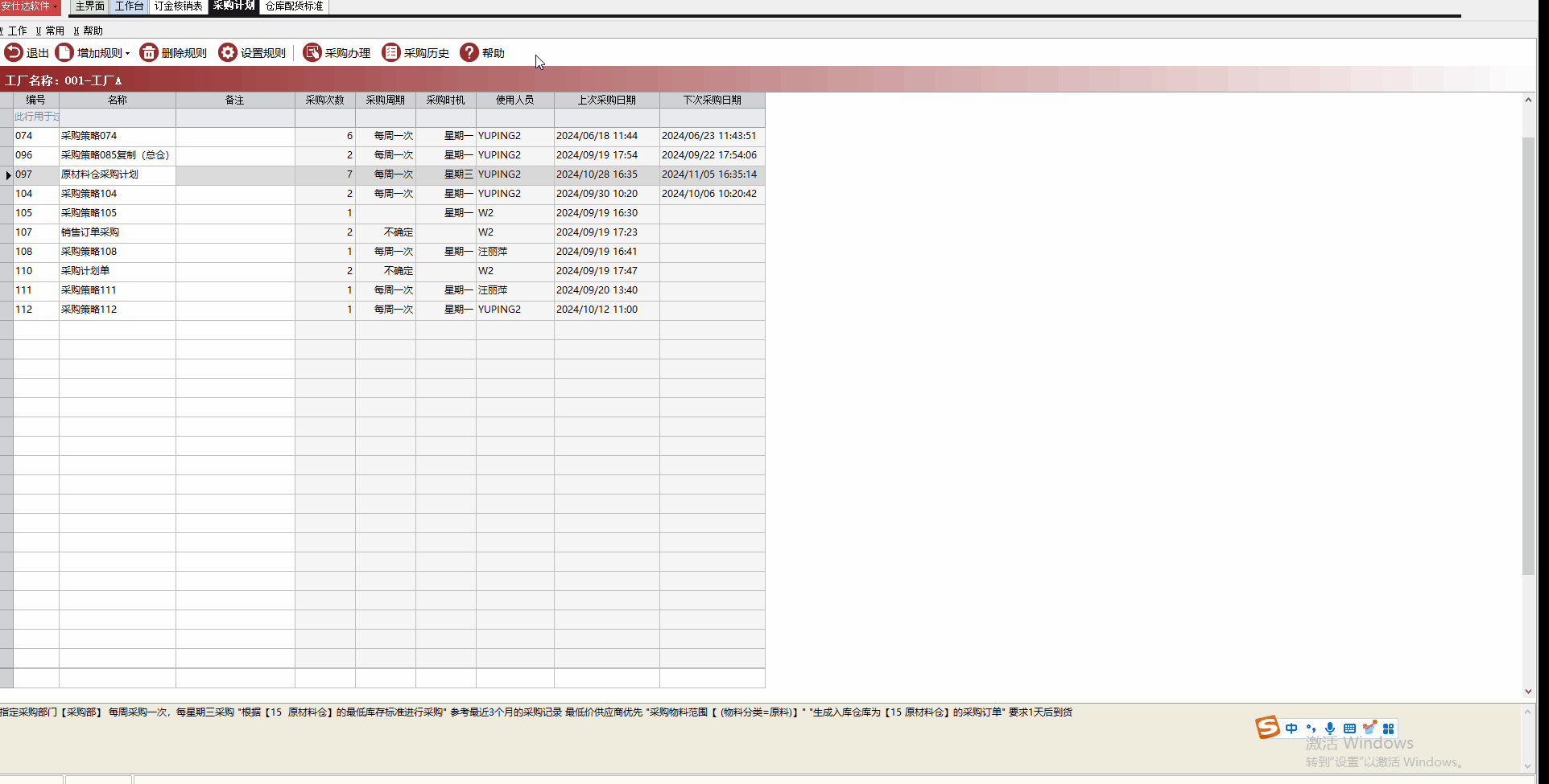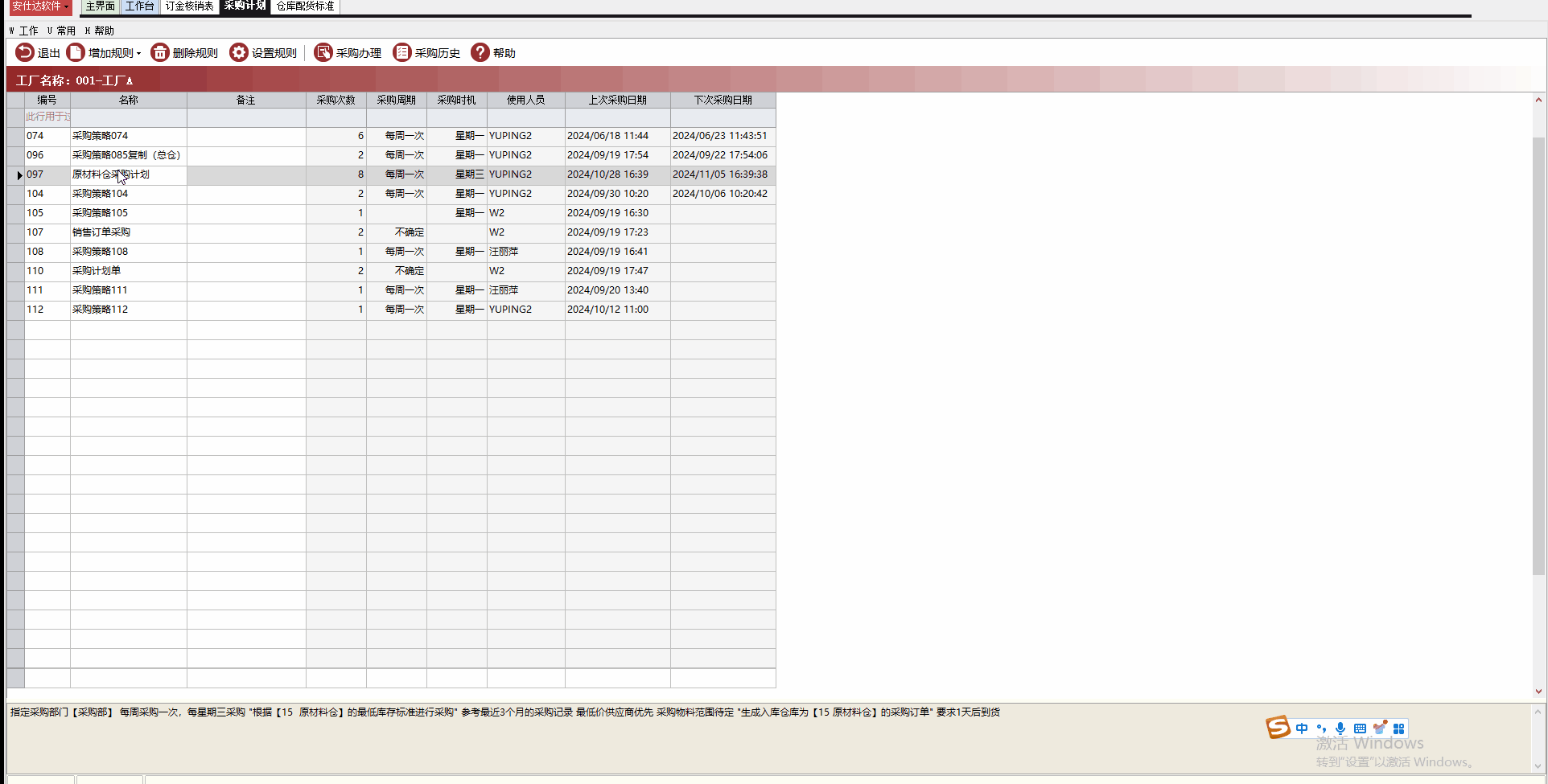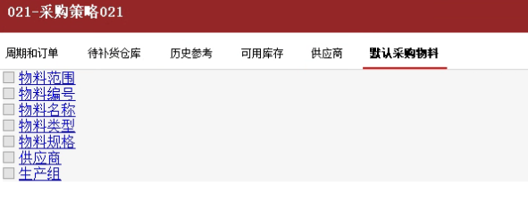 如果我们企业规模比较小,每周一次采购全部物料,或者是完全没有规律,凭感觉来检查有没有缺货的情况,则这里我们建议完全不要进行选择,完全不选择 = 检查全部物料的缺货情况。要使用采购计划功能,我们必须至少定义一个策略策略,策略规则项目的设置,定义好以后,一般建议不要随便地反复修改。