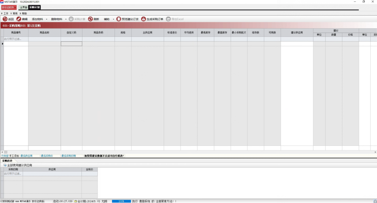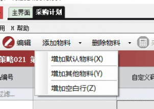 增加默认物料功能:系统自动调取当前的规则去检查有没有需要采购物料,如果有就添加到下面的采购表格中,并且给出建议供应商和建议价格。增加其他物料功能:如果当前的策略没有指定物料的范围条件,则这个功能其实是没有如何意义的,因为前面的功能就已经会分析全部物料了。如果当前的策略系统是指定了物料范围条件的,这个功能会弹出对话框,让我们选择其他类别条件的物料去分析是否需要采购。