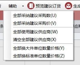 这里增加了一些批量设置的功能,从操作逻辑上,可以这样理解:系统生成了一大堆的采购建议,我们采购人员如果有精力处理他们,就手工一条一条地进行判断和处理,如果没有精力或者想偷懒,就可以先手工处理确认一些重要的物料采购,然后不重要的物料采购,可以直接全部批量采纳系统的建议。