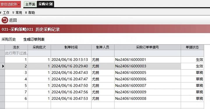 第三步,根据上面的采购计划,来采购物料。系统自动根据设置的规则生成采购物料,之后生成采购订单草稿单。