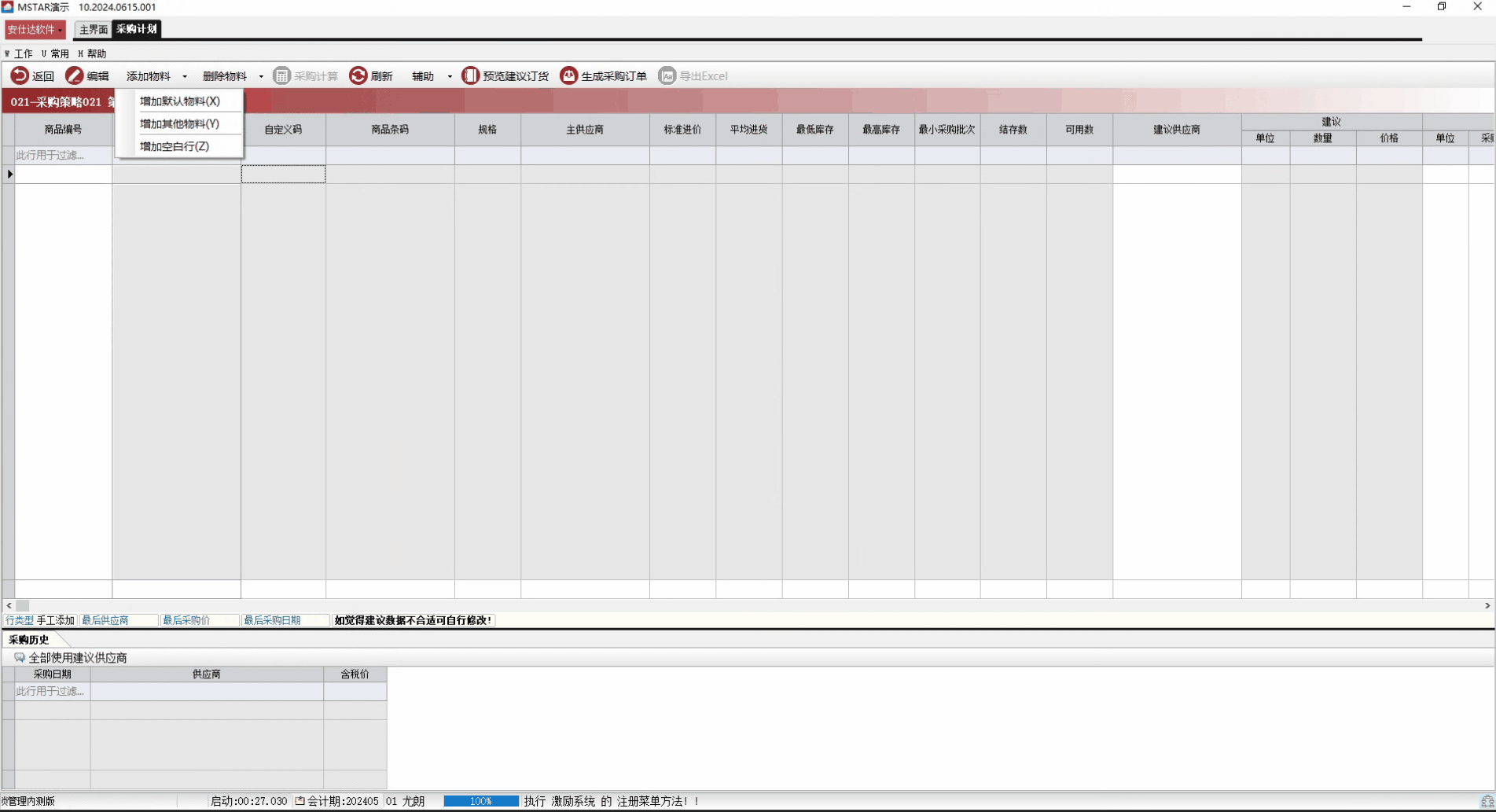 增加空白行功能:这个功能很简单,就是在下面的表格增加空白行,然后自己手工去输入想采购的物料。