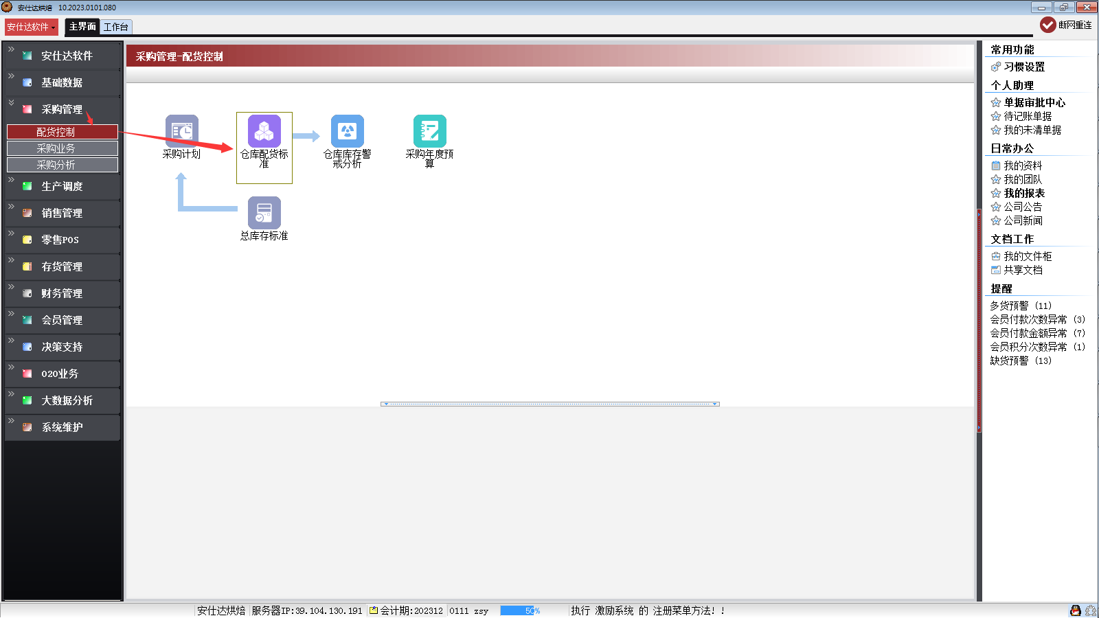 路径:【进入系统】→【采购管理】→【配货控制】→【仓库配货标准】