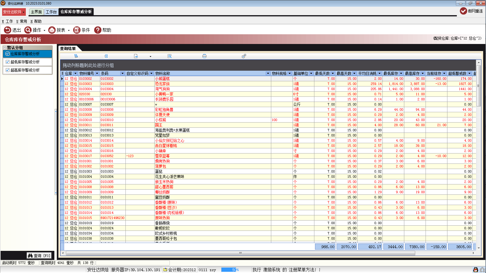 仓库库存警戒分析查询:红色:表示当前库存低于安全库存范围,需要及时补充库存了。 黄色:表示当前库存高于安全库存范围。