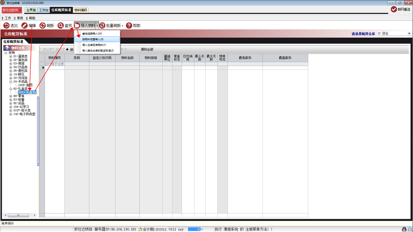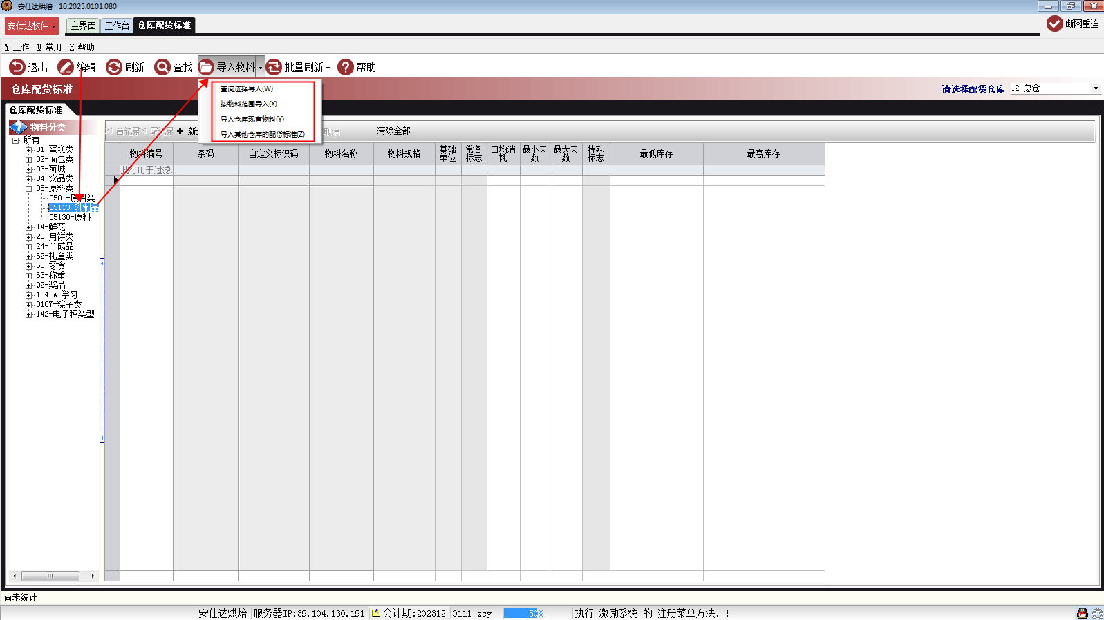 2.点击编辑,选择选择你要设置库存的物料分类,在进行导入物料,导入物料一共五种导入方式: