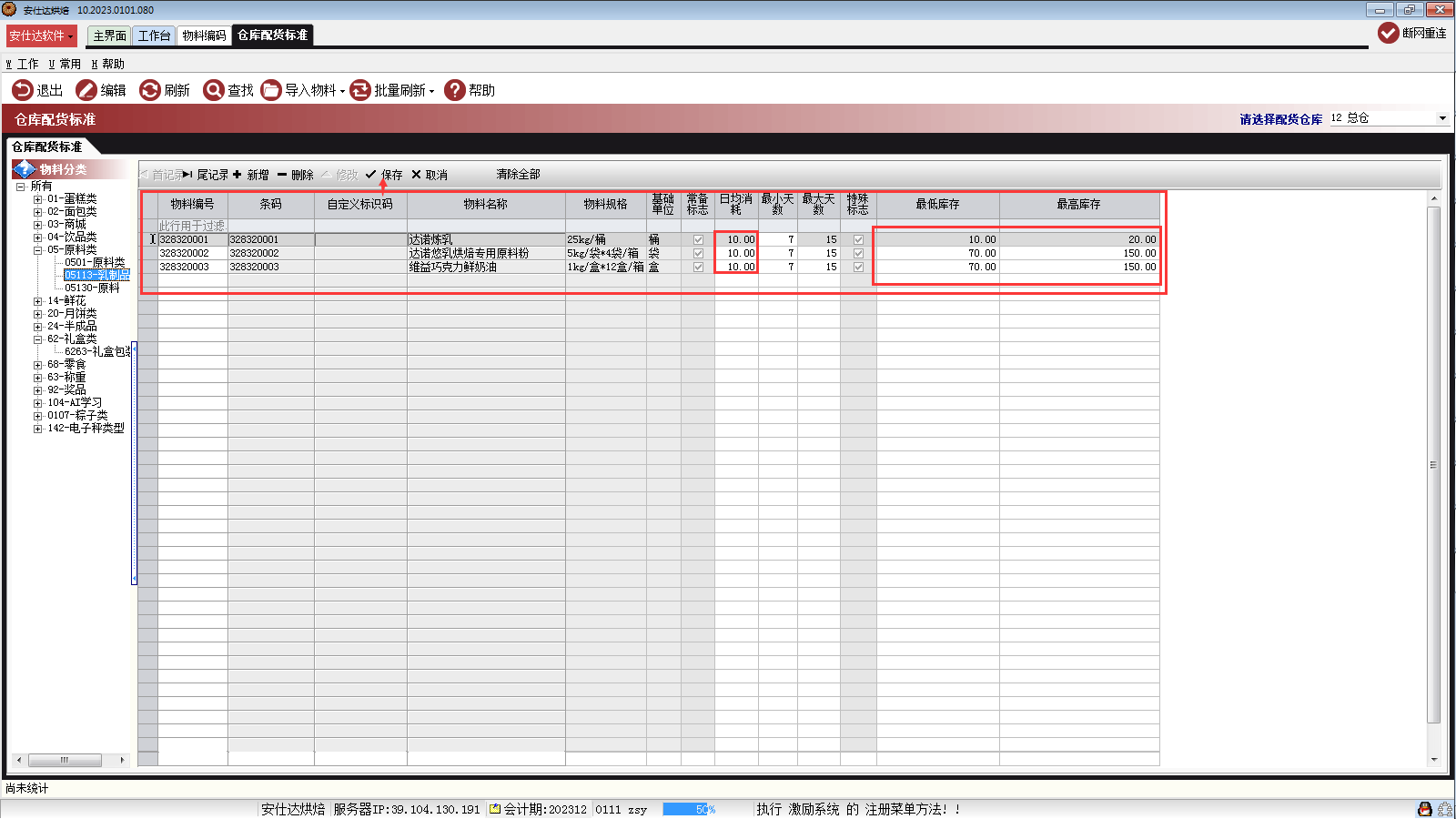日均消耗:此物料平均每天的消耗,可以不填写,如果填写了,则最低库存和最高库存会根据最小天数和最大天数自动计算出来。公式:最低库存=日均消耗×最小天数,最高库存=日均消耗×最大天数。